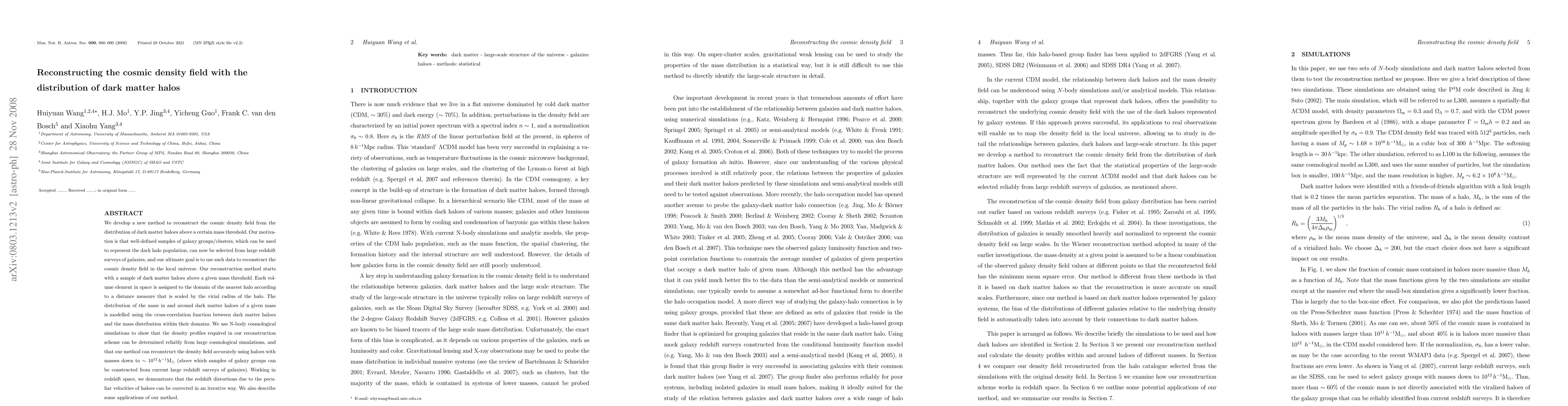 We develop a new method to reconstruct the cosmic density field from the distribution of dark matter haloes above a certain mass threshold. Our motivation is that well-defined samples of galaxy groups/clusters, which can be used to represent the dark halo population, can now be selected from large redshift surveys of galaxies, and our ultimate goal is to use such data to reconstruct the cosmic density field in the local universe. Our reconstruction method starts with a sample of dark matter haloes above a given mass threshold. Each volume element in space is assigned to the domain of the nearest halo according to a distance measure that is scaled by the virial radius of the halo. The distribution of the mass in and around dark matter haloes of a given mass is modelled using the cross-correlation function between dark matter haloes and the mass distribution within their domains. We use N-body cosmological simulations to show that the density profiles required in our reconstruction scheme can be determined reliably from large cosmological simulations, and that our method can reconstruct the density field accurately using haloes with masses down to $\sim 10^{12}\msun$ (above which samples of galaxy groups can be constructed from current large redshift surveys of galaxies). Working in redshift space, we demonstrate that the redshift distortions due to the peculiar velocities of haloes can be corrected in an iterative way. We also describe some applications of our method.