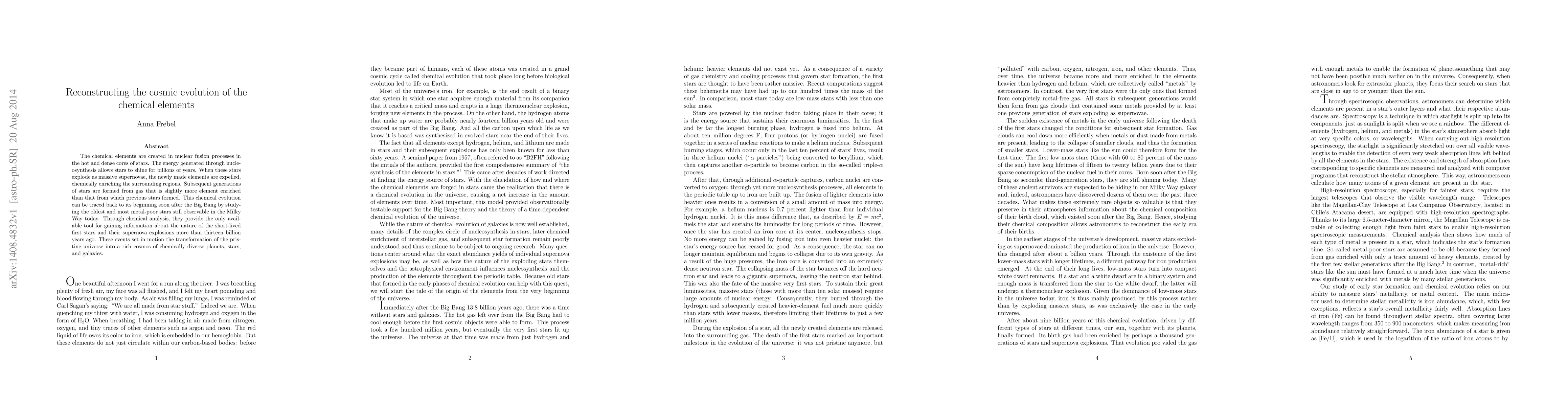 The chemical elements are created in nuclear fusion processes in the hot and dense cores of stars. The energy generated through nucleosynthesis allows stars to shine for billions of years. When these stars explode as massive supernovae, the newly made elements are expelled, chemically enriching the surrounding regions. Subsequent generations of stars are formed from gas that is slightly more element enriched than that from which previous stars formed. This chemical evolution can be traced back to its beginning soon after the Big Bang by studying the oldest and most metal-poor stars still observable in the Milky Way today. Through chemical analysis, they provide the only available tool for gaining information about the nature of the short-lived first stars and their supernova explosions more than thirteen billion years ago. These events set in motion the transformation of the pristine universe into a rich cosmos of chemically diverse planets, stars, and galaxies.