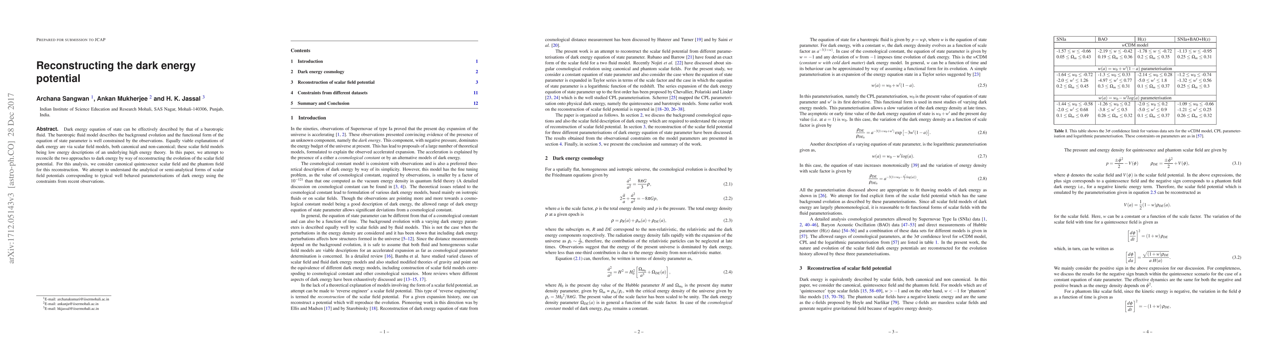 Researchers attempt to reconcile dark energy theories by reconstructing scalar field potentials, which describe the evolution of a hypothetical underlying theory. They focus on two approaches: barotropic fluid models and canonical quintessence scalar fields, with implications for understanding dark energy's role in the universe.