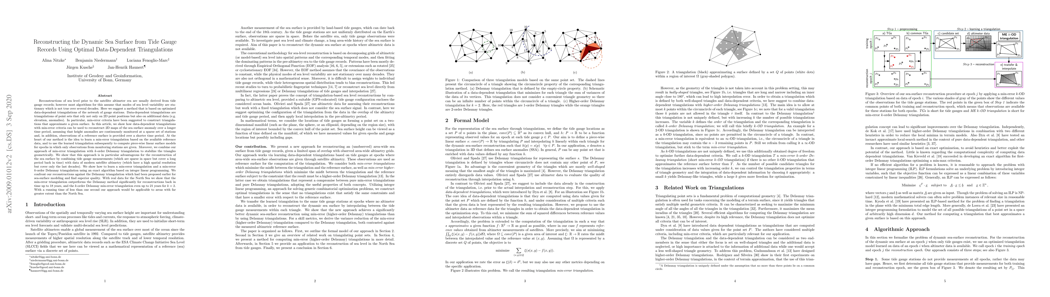 Reconstructions of sea level prior to the satellite altimeter era are usually derived from tide gauge records; however most algorithms for this assume that modes of sea level variability are stationary which is not true over several decades. Here we suggest a method that is based on optimized data-dependent triangulations of the network of gauge stations. Data-dependent triangulations are triangulations of point sets that rely not only on 2D point positions but also on additional data (e.g. elevation, anomalies). In this article, we show how data-dependent triangulations with min-error criteria can be used to reconstruct 2D maps of the sea surface anomaly over a longer time period, assuming that height anomalies are continuously monitored at a sparse set of stations and, in addition, observations of a reference surface is provided over a shorter time period. At the heart of our method is the idea to learn a min-error triangulation based on the available reference data, and to use the learned triangulation subsequently to compute piece-wise linear surface models for epochs in which only observations from monitoring stations are given. We combine our approach of min-error triangulation with $k$-order Delaunay triangulation to stabilize the triangles geometrically. We show that this approach is advantageous for the reconstruction of the sea surface by combining tide gauge measurements with data of modern satellite altimetry. We show how to learn a min-error triangulation and a min-error $k$-order Delaunay triangulation using integer linear programming. We confront our reconstructions against the Delaunay triangulation. With real data for the North Sea we show that the min-error triangulation outperforms the Delaunay method significantly for reconstructions back in time up to 18 years, and the $k$-order Delaunay min-error triangulation even up to 21 years for $k=2$.