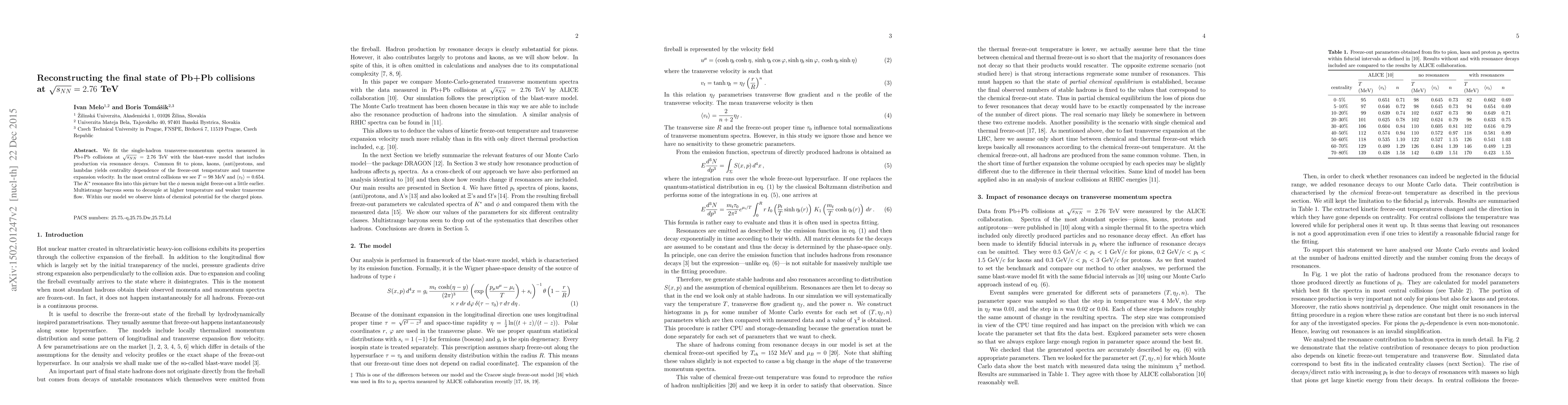 We fit the single-hadron transverse-momentum spectra measured in Pb+Pb collisions at $\sqrt{s_{NN}} = 2.76$ TeV with the blast-wave model that includes production via resonance decays. Common fit to pions, kaons, (anti)protons, and lambdas yields centrality dependence of the freeze-out temperature and transverse expansion velocity. In the most central collisions we see $T=98$ MeV and $\langle v_t \rangle = 0.654$. The $K^*$ resonance fits into this picture but the $\phi$ meson might freeze-out a little earlier. Multistrange baryons seem to decouple at higher temperature and weaker transverse flow. Within our model we observe hints of chemical potential for the charged pions.