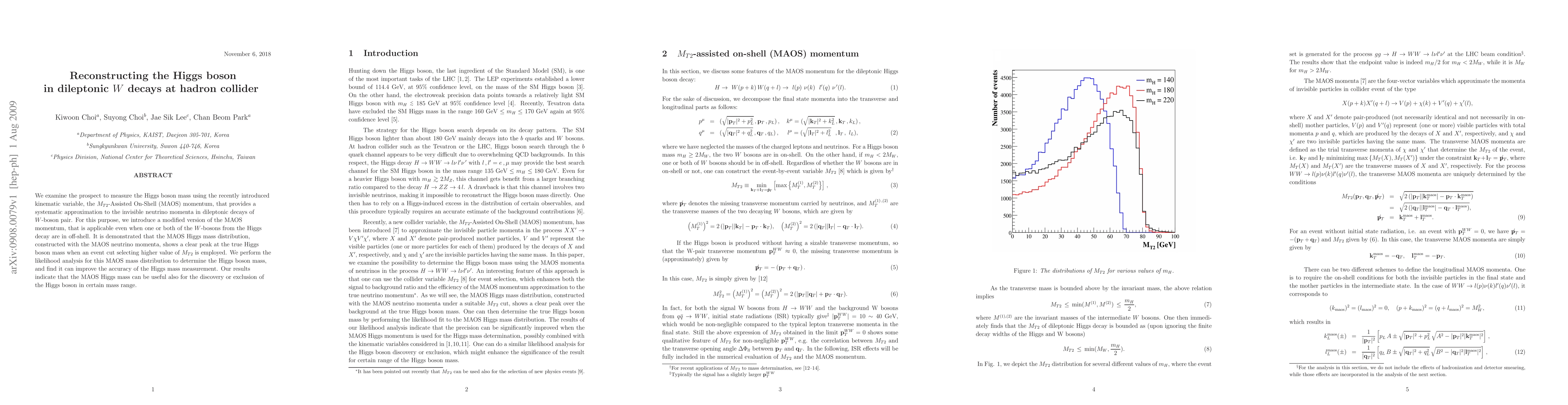 This paper proposes a new method to measure the Higgs boson mass using the M_T2-Assisted On-Shell (MAOS) momentum in dileptonic W decays, showing a clear peak at the true mass when higher M_T2 values are selected. The modified MAOS momentum improves the accuracy of Higgs mass measurement and can aid in its discovery or exclusion within certain ranges.