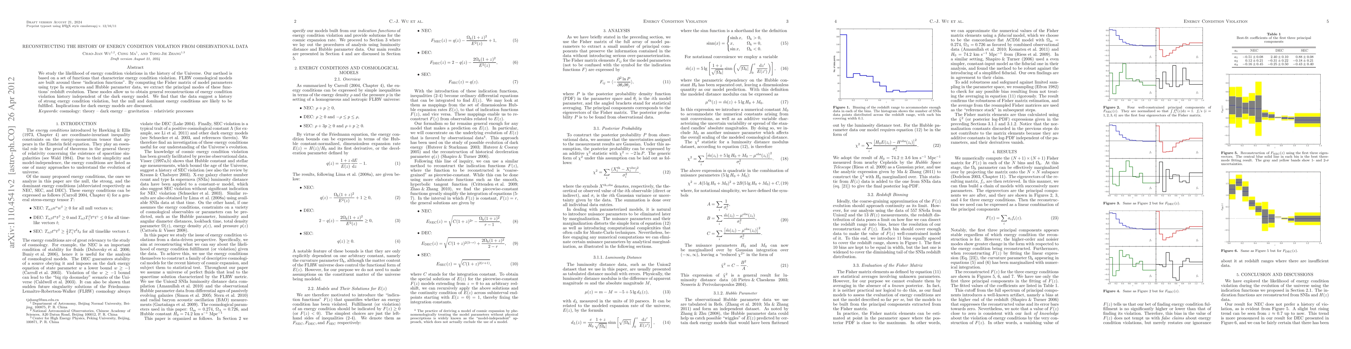 We study the likelihood of energy condition violations in the history of the Universe. Our method is based on a set of functions that characterize energy condition violation. FLRW cosmological models are built around these "indication functions". By computing the Fisher matrix of model parameters using type Ia supernova and Hubble parameter data, we extract the principal modes of these functions' redshift evolution. These modes allow us to obtain general reconstructions of energy condition violation history independent of the dark energy model. We find that the data suggest a history of strong energy condition violation, but the null and dominant energy conditions are likely to be fulfilled. Implications for dark energy models are discussed.