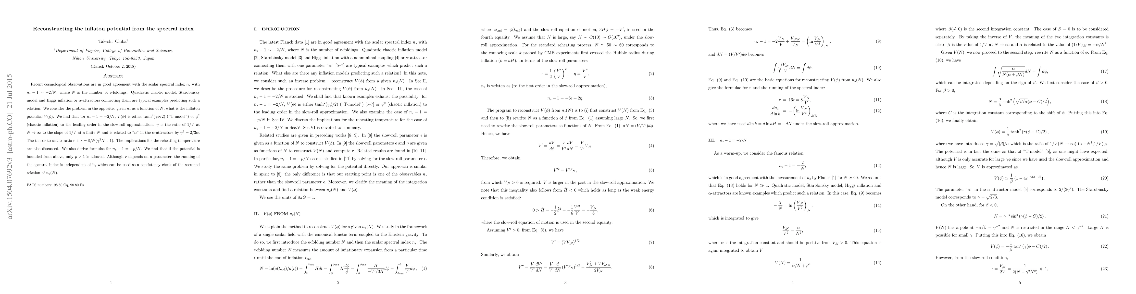Recent cosmological observations are in good agreement with the scalar spectral index $n_s$ with $n_s-1\sim -2/N$, where $N$ is the number of e-foldings. Quadratic chaotic model, Starobinsky model and Higgs inflation or $\alpha$-attractors connecting them are typical examples predicting such a relation. We consider the problem in the opposite: given $n_s$ as a function of $N$, what is the inflaton potential $V(\phi)$. We find that for $n_s-1=-2/N$, $V(\phi)$ is either $\tanh^2(\gamma\phi/2)$ ("T-model") or $\phi^2$ (chaotic inflation) to the leading order in the slow-roll approximation. $\gamma$ is the ratio of $1/V$ at $N\rightarrow \infty$ to the slope of $1/V$ at a finite $N$ and is related to "$\alpha$" in the $\alpha$-attractors by $\gamma^2=2/3\alpha$. The tensor-to-scalar ratio $r$ is $r=8/N(\gamma^2 N +1) $. The implications for the reheating temperature are also discussed. We also derive formulas for $n_s-1=-p/N$. We find that if the potential is bounded from above, only $p>1$ is allowed. Although $r$ depends on a parameter, the running of the spectral index is independent of it, which can be used as a consistency check of the assumed relation of $n_s(N)$.