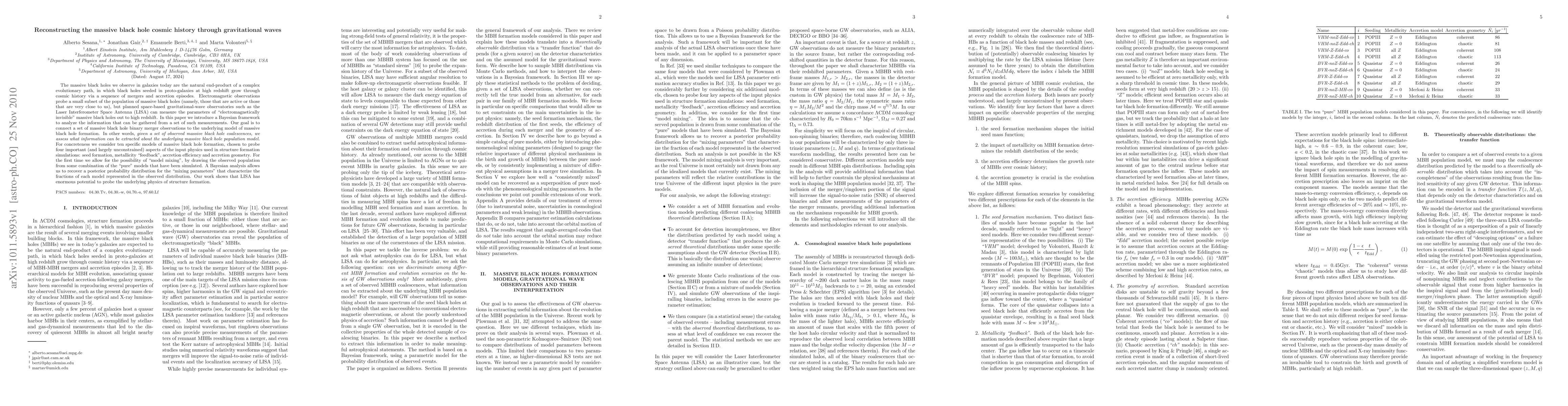 The massive black holes we observe in galaxies today are the natural end-product of a complex evolutionary path, in which black holes seeded in proto-galaxies at high redshift grow through cosmic history via a sequence of mergers and accretion episodes. Electromagnetic observations probe a small subset of the population of massive black holes (namely, those that are active or those that are very close to us), but planned space-based gravitational-wave observatories such as the Laser Interferometer Space Antenna (LISA) can measure the parameters of ``electromagnetically invisible'' massive black holes out to high redshift. In this paper we introduce a Bayesian framework to analyze the information that can be gathered from a set of such measurements. Our goal is to connect a set of massive black hole binary merger observations to the underlying model of massive black hole formation. In other words, given a set of observed massive black hole coalescences, we assess what information can be extracted about the underlying massive black hole population model. For concreteness we consider ten specific models of massive black hole formation, chosen to probe four important (and largely unconstrained) aspects of the input physics used in structure formation simulations: seed formation, metallicity ``feedback'', accretion efficiency and accretion geometry. For the first time we allow for the possibility of ``model mixing'', by drawing the observed population from some combination of the ``pure'' models that have been simulated. A Bayesian analysis allows us to recover a posterior probability distribution for the ``mixing parameters'' that characterize the fractions of each model represented in the observed distribution. Our work shows that LISA has enormous potential to probe the underlying physics of structure formation.