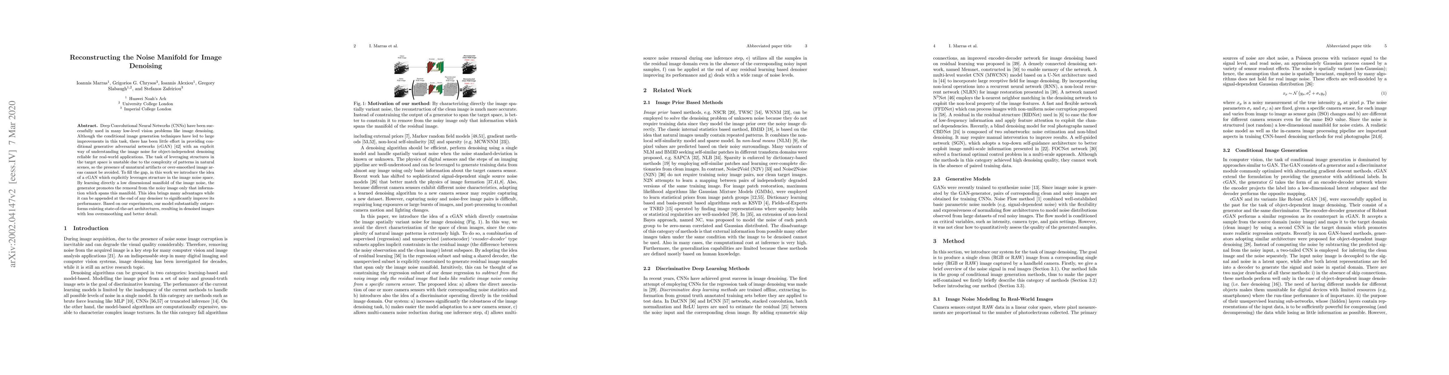 Deep Convolutional Neural Networks (CNNs) have been successfully used in many low-level vision problems like image denoising. Although the conditional image generation techniques have led to large improvements in this task, there has been little effort in providing conditional generative adversarial networks (cGAN)[42] with an explicit way of understanding the image noise for object-independent denoising reliable for real-world applications. The task of leveraging structures in the target space is unstable due to the complexity of patterns in natural scenes, so the presence of unnatural artifacts or over-smoothed image areas cannot be avoided. To fill the gap, in this work we introduce the idea of a cGAN which explicitly leverages structure in the image noise space. By learning directly a low dimensional manifold of the image noise, the generator promotes the removal from the noisy image only that information which spans this manifold. This idea brings many advantages while it can be appended at the end of any denoiser to significantly improve its performance. Based on our experiments, our model substantially outperforms existing state-of-the-art architectures, resulting in denoised images with less oversmoothing and better detail.