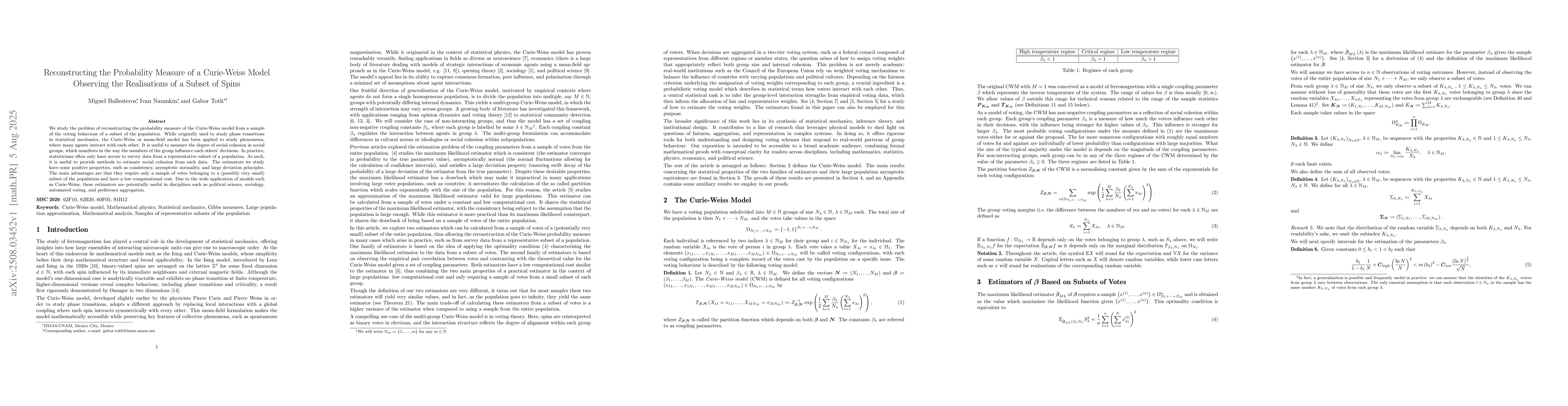 We study the problem of reconstructing the probability measure of the Curie-Weiss model from a sample of the voting behaviour of a subset of the population. While originally used to study phase transitions in statistical mechanics, the Curie-Weiss or mean-field model has been applied to study phenomena, where many agents interact with each other. It is useful to measure the degree of social cohesion in social groups, which manifests in the way the members of the group influence each others' decisions. In practice, statisticians often only have access to survey data from a representative subset of a population. As such, it is useful to provide methods to estimate social cohesion from such data. The estimators we study have some positive properties, such as consistency, asymptotic normality, and large deviation principles. The main advantages are that they require only a sample of votes belonging to a (possibly very small) subset of the population and have a low computational cost. Due to the wide application of models such as Curie-Weiss, these estimators are potentially useful in disciplines such as political science, sociology, automated voting, and preference aggregation.