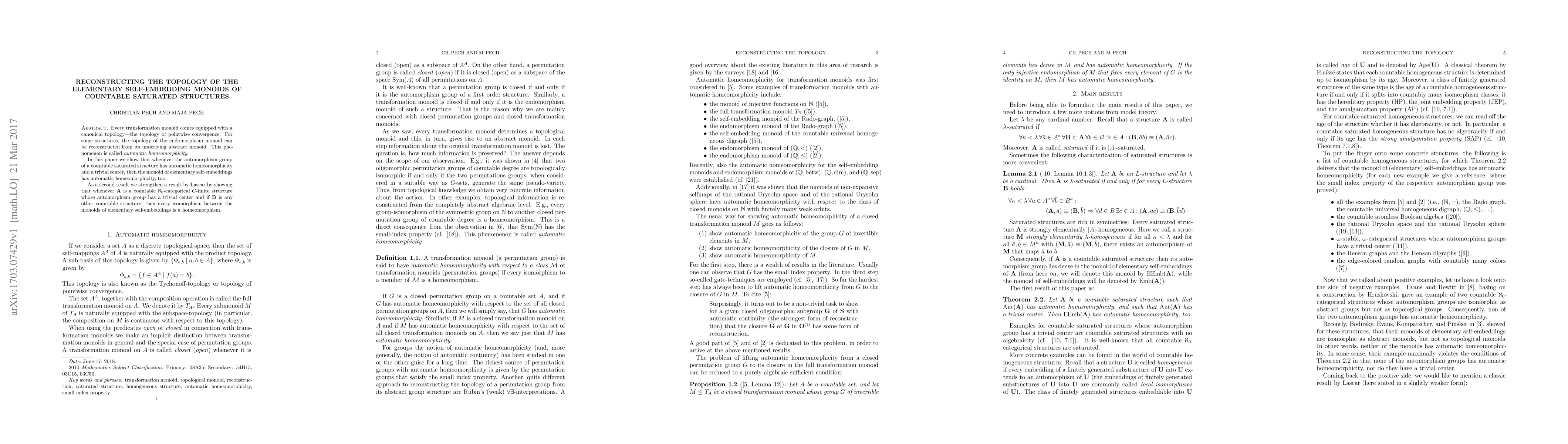 Every transformation monoid comes equipped with a canonical topology-the topology of pointwise convergence. For some structures, the topology of the endomorphism monoid can be reconstructed from its underlying abstract monoid. This phenomenon is called automatic homeomorphicity. In this paper we show that whenever the automorphism group of a countable saturated structure has automatic homeomorphicity and a trivial center, then the monoid of elementary self-embeddings has automatic homeomorphicity, too. As a second result we strengthen a result by Lascar by showing that whenever $\mathbf{A}$ is a countable $\aleph_0$-categorical $G$-finite structure whose automorphism group has a trivial center and if $\mathbf{B}$ is any other countable structure, then every isomorphism between the monoids of elementary self-embeddings is a homeomorphism.