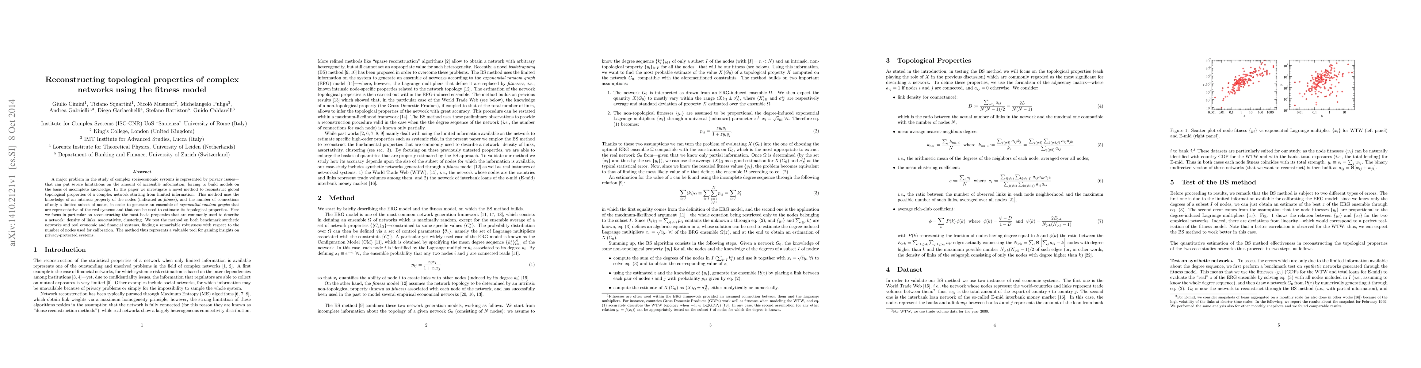A major problem in the study of complex socioeconomic systems is represented by privacy issues$-$that can put severe limitations on the amount of accessible information, forcing to build models on the basis of incomplete knowledge. In this paper we investigate a novel method to reconstruct global topological properties of a complex network starting from limited information. This method uses the knowledge of an intrinsic property of the nodes (indicated as fitness), and the number of connections of only a limited subset of nodes, in order to generate an ensemble of exponential random graphs that are representative of the real systems and that can be used to estimate its topological properties. Here we focus in particular on reconstructing the most basic properties that are commonly used to describe a network: density of links, assortativity, clustering. We test the method on both benchmark synthetic networks and real economic and financial systems, finding a remarkable robustness with respect to the number of nodes used for calibration. The method thus represents a valuable tool for gaining insights on privacy-protected systems.