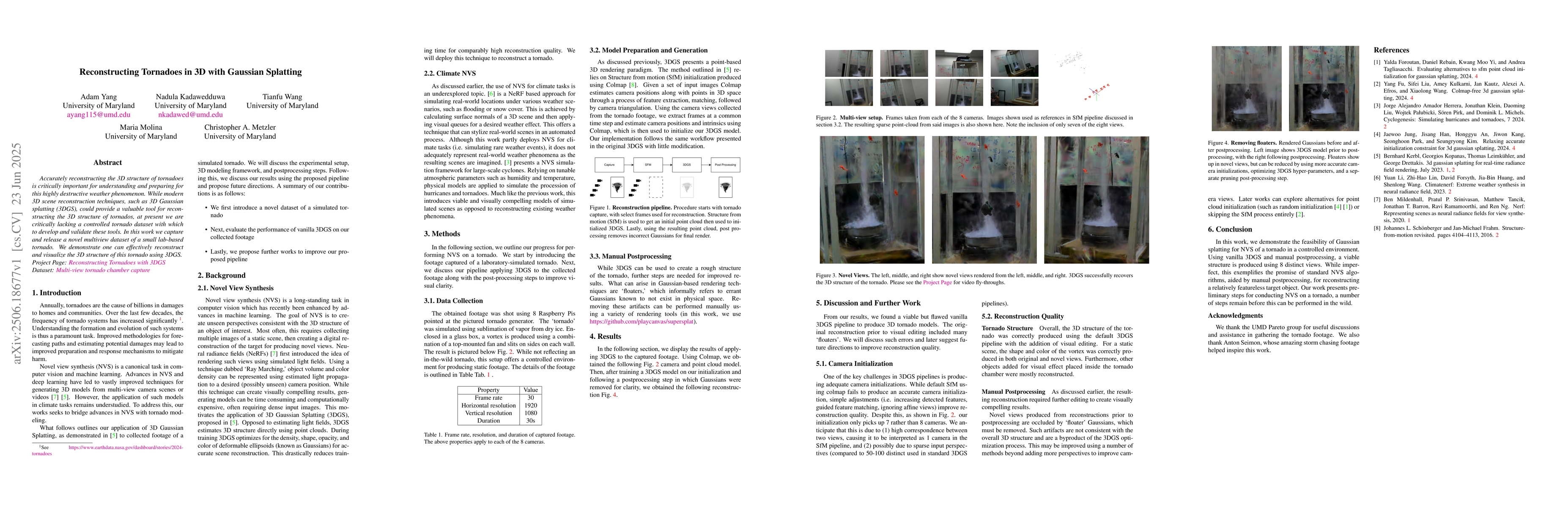This research introduces a novel multiview dataset of a lab-based tornado, enabling the application of 3D Gaussian splatting (3DGS) for 3D reconstruction and visualization of tornado structure, addressing the current lack of controlled datasets for such studies.