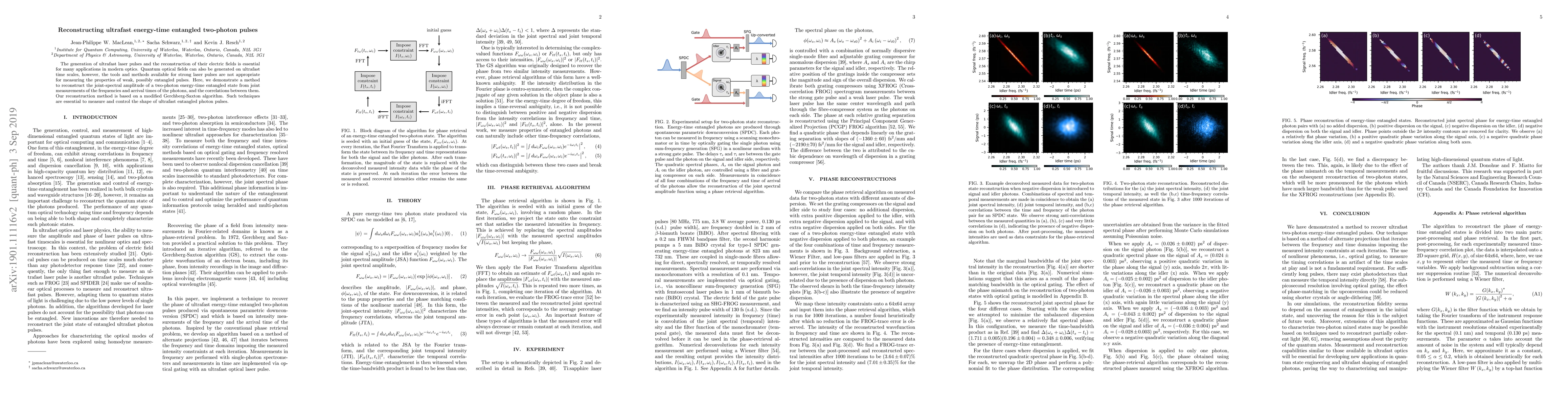 The generation of ultrafast laser pulses and the reconstruction of their electric fields is essential for many applications in modern optics. Quantum optical fields can also be generated on ultrafast time scales, however, the tools and methods available for strong laser pulses are not appropriate for measuring the properties of weak, possibly entangled pulses. Here, we demonstrate a method to reconstruct the joint-spectral amplitude of a two-photon energy-time entangled state from joint measurements of the frequencies and arrival times of the photons, and the correlations between them. Our reconstruction method is based on a modified Gerchberg-Saxton algorithm. Such techniques are essential to measure and control the shape of ultrafast entangled photon pulses.