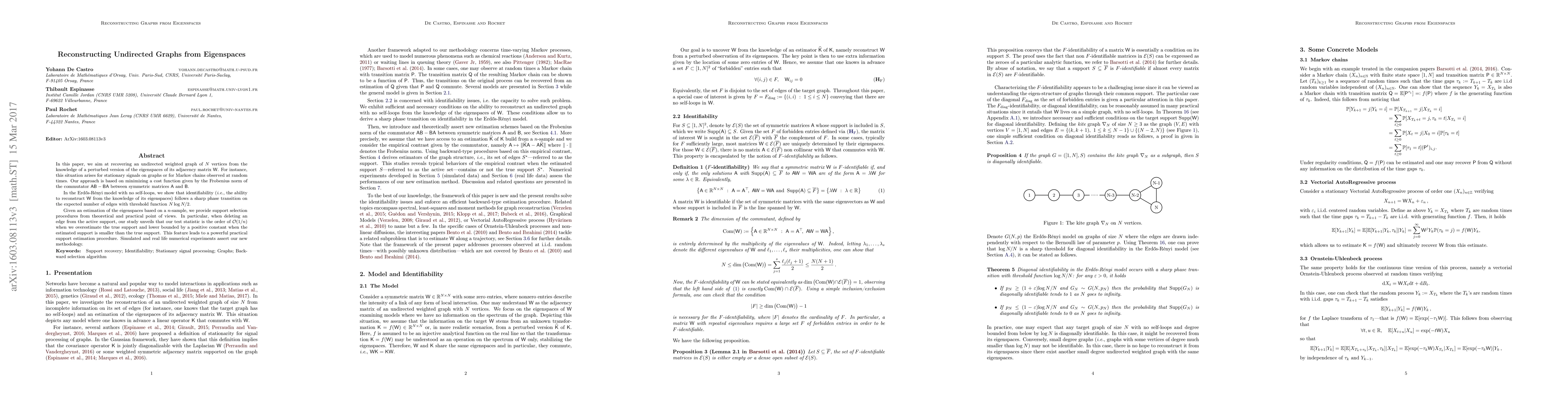 In this paper, we aim at recovering an undirected weighted graph of $N$ vertices from the knowledge of a perturbed version of the eigenspaces of its adjacency matrix $W$. For instance, this situation arises for stationary signals on graphs or for Markov chains observed at random times. Our approach is based on minimizing a cost function given by the Frobenius norm of the commutator $\mathsf{A} \mathsf{B}-\mathsf{B} \mathsf{A}$ between symmetric matrices $\mathsf{A}$ and $\mathsf{B}$. In the Erd\H{o}s-R\'enyi model with no self-loops, we show that identifiability (i.e., the ability to reconstruct $W$ from the knowledge of its eigenspaces) follows a sharp phase transition on the expected number of edges with threshold function $N\log N/2$. Given an estimation of the eigenspaces based on a $n$-sample, we provide support selection procedures from theoretical and practical point of views. In particular, when deleting an edge from the active support, our study unveils that our test statistic is the order of $\mathcal O(1/n)$ when we overestimate the true support and lower bounded by a positive constant when the estimated support is smaller than the true support. This feature leads to a powerful practical support estimation procedure. Simulated and real life numerical experiments assert our new methodology.