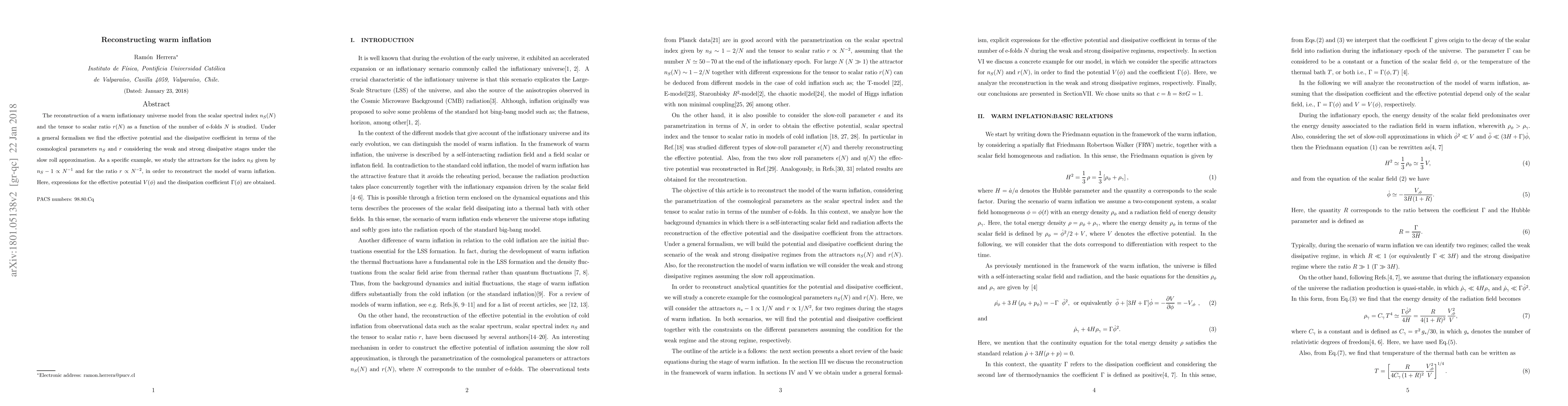 This paper reconstructs a warm inflationary universe model by analyzing the scalar spectral index $n_S$ and tensor to scalar ratio $r$ as functions of e-folds. It derives the effective potential and dissipative coefficient in terms of cosmological parameters, focusing on attractors for specific index and ratio behaviors to reconstruct the model.