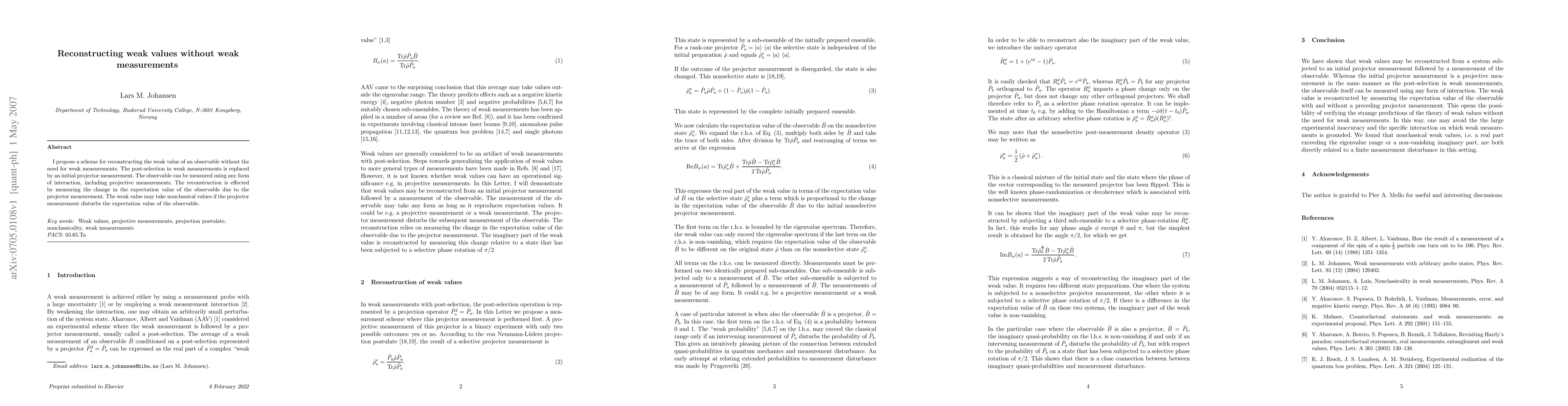 I propose a scheme for reconstructing the weak value of an observable without the need for weak measurements. The post-selection in weak measurements is replaced by an initial projector measurement. The observable can be measured using any form of interaction, including projective measurements. The reconstruction is effected by measuring the change in the expectation value of the observable due to the projector measurement. The weak value may take nonclassical values if the projector measurement disturbs the expectation value of the observable.