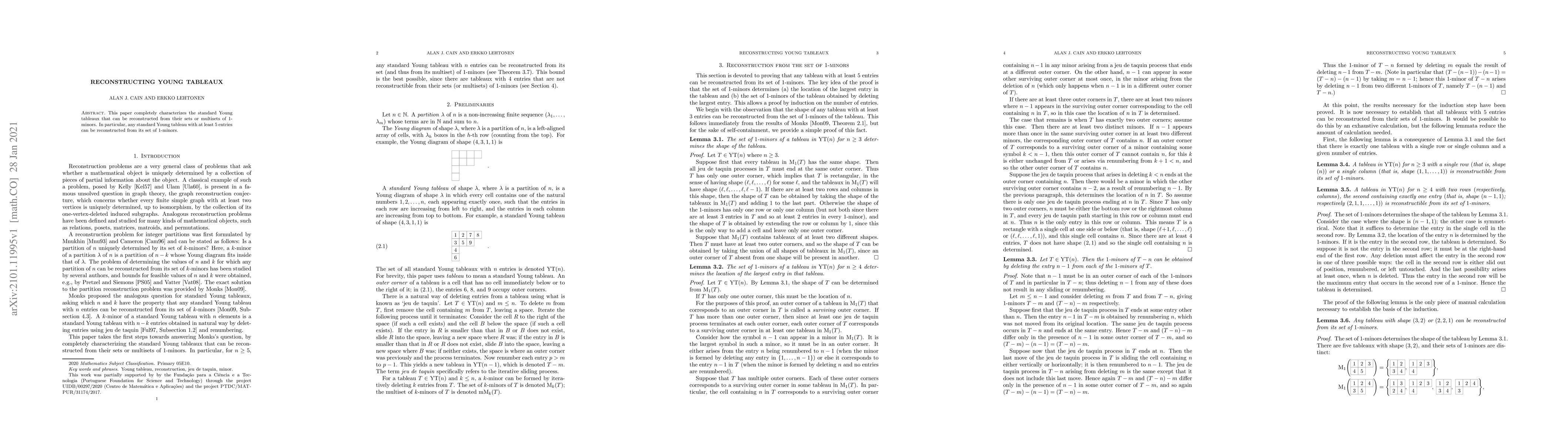 This paper details how standard Young tableaux with at least five entries can be reconstructed from their sets of 1-minors, providing a complete characterization of such reconstructions. The methodology highlights the significance of 1-minors in reconstructing these combinatorial objects.