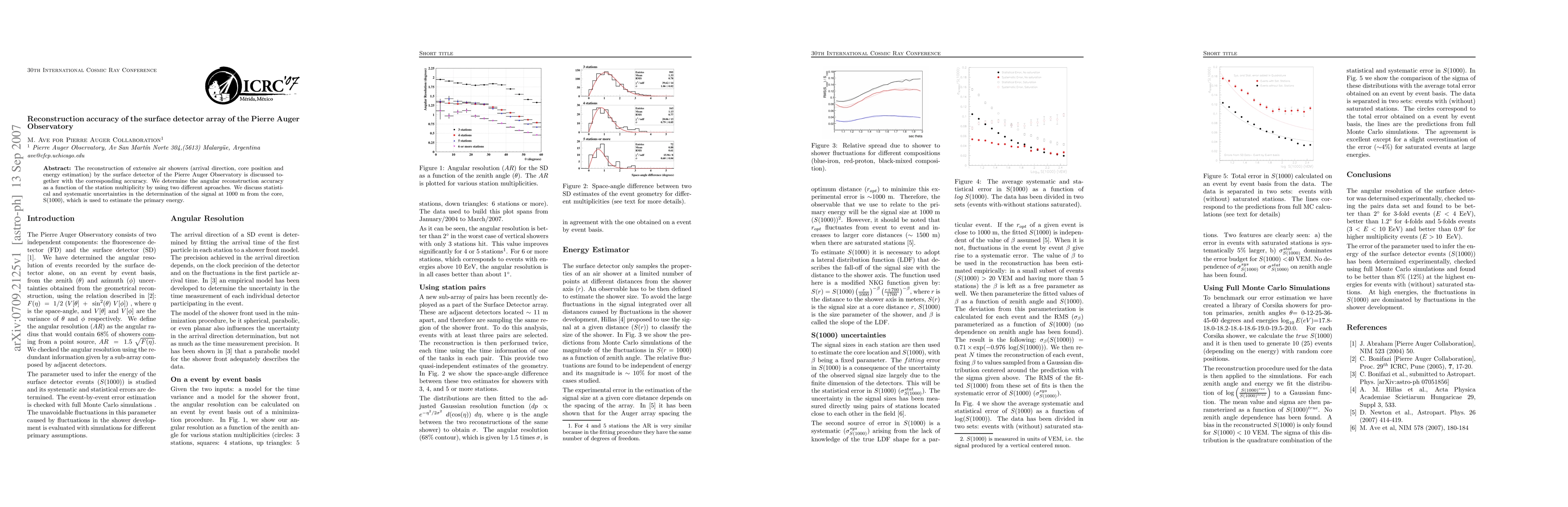 The reconstruction of extensive air showers (arrival direction, core position and energy estimation) by the surface detector of the Pierre Auger Observatory is discussed together with the corresponding accuracy. We determine the angular reconstruction accuracy as a function of the station multiplicity by using two different aproaches. We discuss statistical and systematic uncertainties in the determination of the signal at 1000 m from the core, S(1000), which is used to estimate the primary energy.