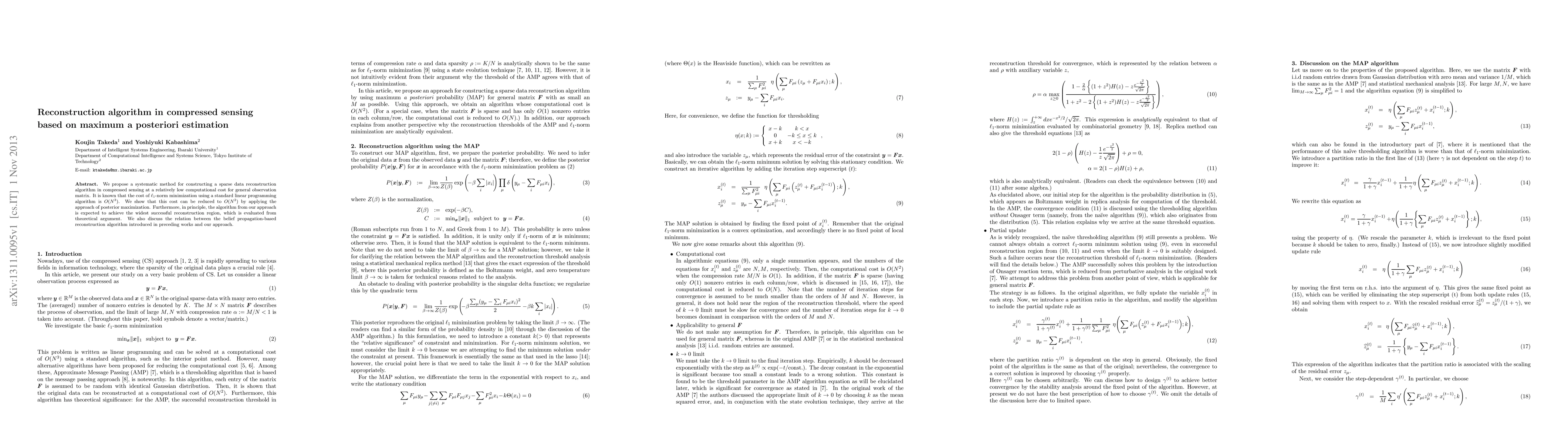 This paper proposes a reconstruction algorithm in compressed sensing using maximum a posteriori estimation to reduce computational cost from O(N^3) to O(N^2), achieving a wider successful reconstruction region compared to l1-norm minimization. It also compares this method with belief propagation-based reconstruction algorithms from previous studies.