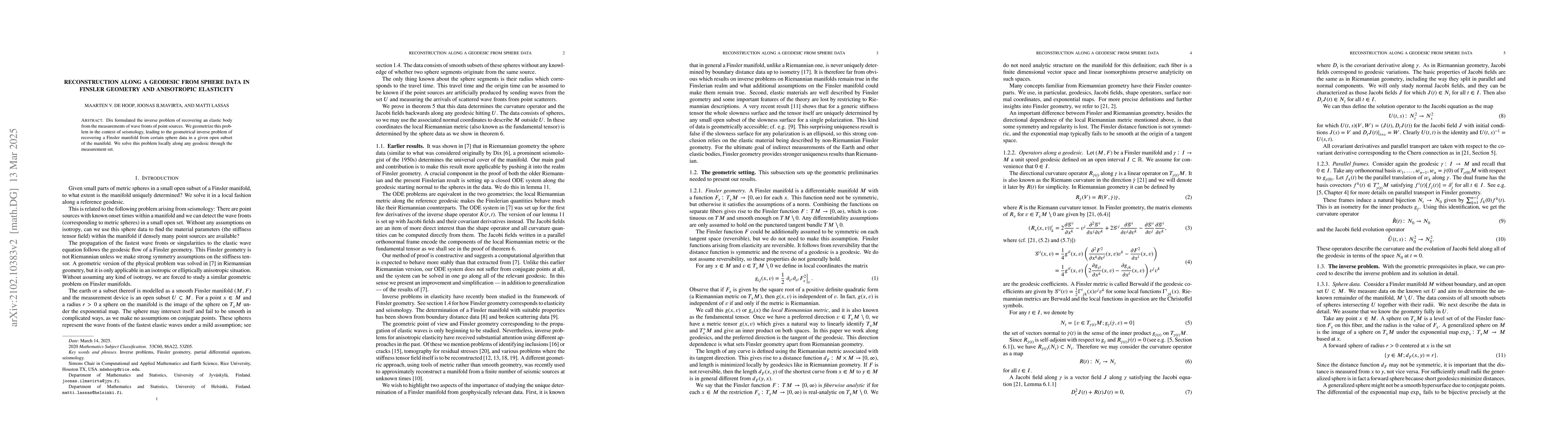 Dix formulated the inverse problem of recovering an elastic body from the measurements of wave fronts of point scatterers. We geometrize this problem in the framework of linear elasticity, leading to the geometrical inverse problem of recovering a Finsler manifold from certain sphere data in a given open subset of the manifold. We solve this problem locally along any geodesic through the measurement set.