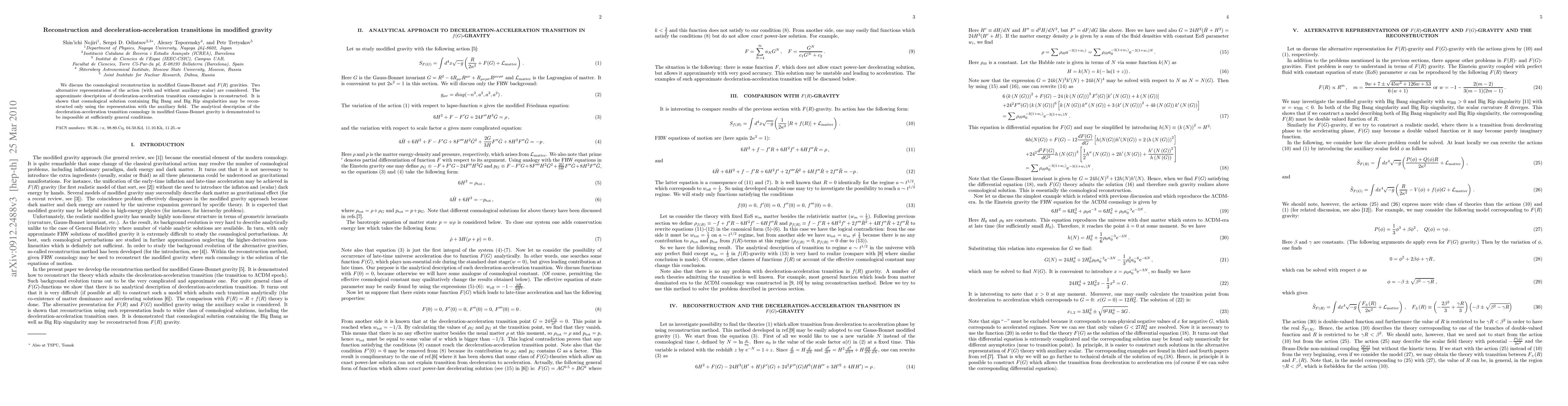 We discuss the cosmological reconstruction in modified Gauss-Bonnet and F(R) gravities. Two alternative representations of the action (with and without auxiliary scalar) are considered. The approximate description of deceleration-acceleration transition cosmologies is reconstructed. It is shown that cosmological solution containing Big Bang and Big Rip singularities may be reconstructed only using the representation with the auxiliary field. The analytical description of the deceleration-acceleration transition cosmology in modified Gauss-Bonnet gravity is demonstrated to be impossible at sufficiently general conditions.