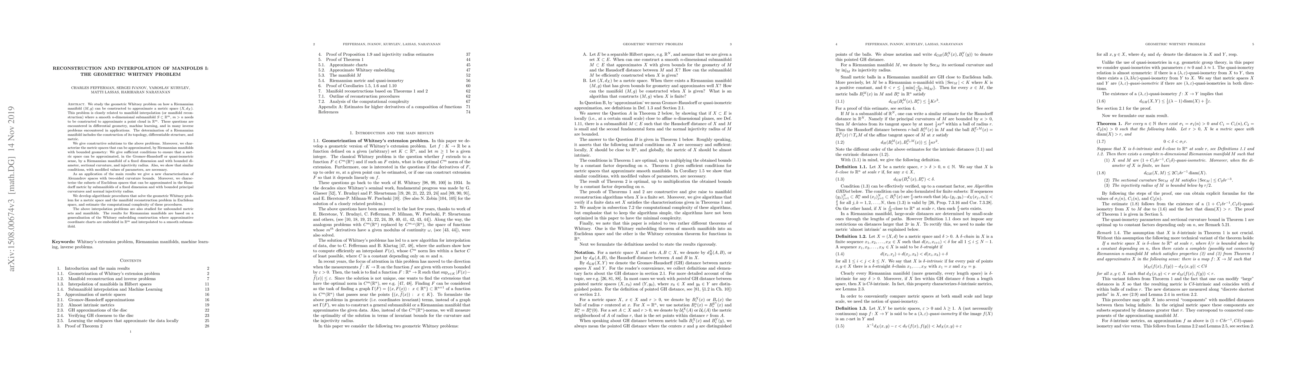 This paper solves the geometric Whitney problem, which involves reconstructing a Riemannian manifold to approximate a metric space, and provides sufficient conditions for approximation in various senses and characterizes certain subsets of Euclidean spaces that can be approximated by submanifolds with bounded principal curvatures and normal injectivity radius.