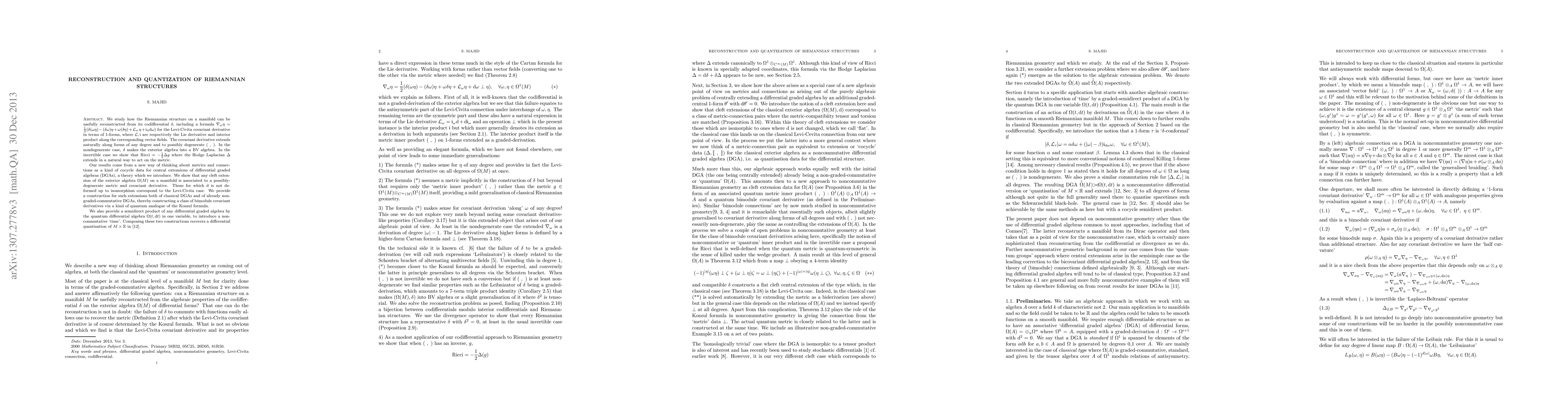 We study how the Riemannian structure on a manifold can be usefully reconstructed from its codifferential $\delta$, including a formula $\nabla_\omega\eta={1\over 2}( \delta(\omega\eta)-(\delta\omega)\eta+\omega(\delta\eta) +L_\omega(\eta)+i_\eta d \omega)$ for the Levi-Civita covariant derivative in terms of 1-forms, where $L, i$ are respectively the Lie derivative and interior product along the corresponding vector fields. The covariant derivative extends naturally along forms of any degree and to possibly degenerate $(\ ,\ )$. In the nondegenerate case, $\delta$ makes the exterior algebra into a BV algebra. In the invertible case we show that ${\rm Ricci}=-{1\over 2}\Delta g$ where the Hodge Laplacian $\Delta$ extends in a natural way to act on the metric. Our results come from a new way of thinking about metrics and connections as a kind of cocycle data for central extensions of differential graded algebras (DGAs), a theory which we introduce. We show that any cleft extension of the exterior algebra $\Omega(M)$ on a manifold is associated to a possibly-degenerate metric and covariant derivative. Those for which $d$ is not deformed up to isomorphism correspond to the Levi-Civita case. We provide a construction for such extensions both of classical DGAs and of already non-graded-commutative DGAs, thereby constructing a class of bimodule covariant derivatives via a kind of quantum analogue of the Koszul formula. We also provide a semidirect product of any differential graded algebra by the quantum differential algebra $\Omega(t,d t)$ in one variable, to introduce a noncommutative `time'. Composing these two constructions recovers a previous differential quantisation of $M\times R$.