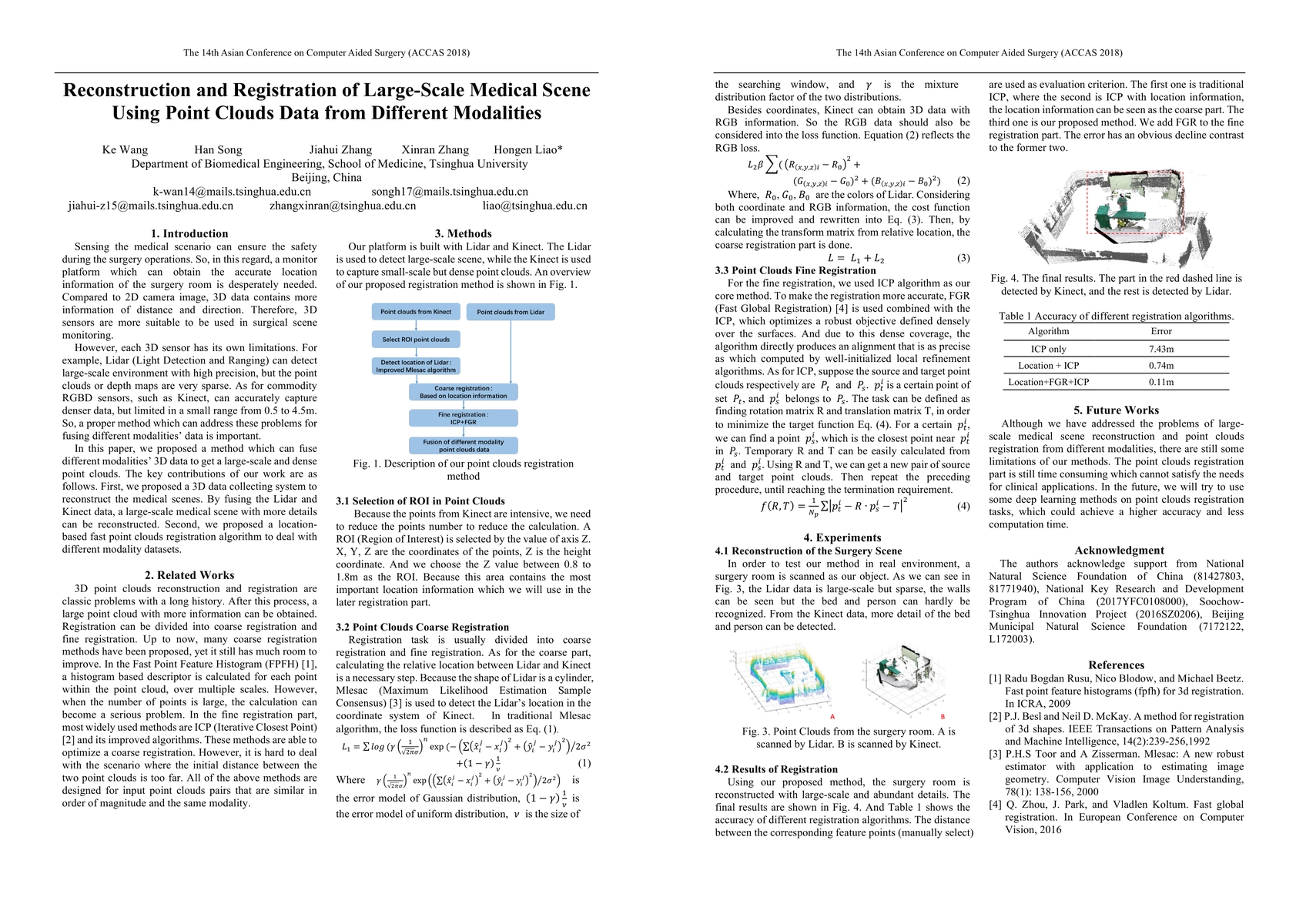 Researchers developed a method to fuse Lidar and Kinect data for reconstructing large-scale medical scenes with high precision and density. They also proposed a fast point clouds registration algorithm to address the challenges of different modalities.
