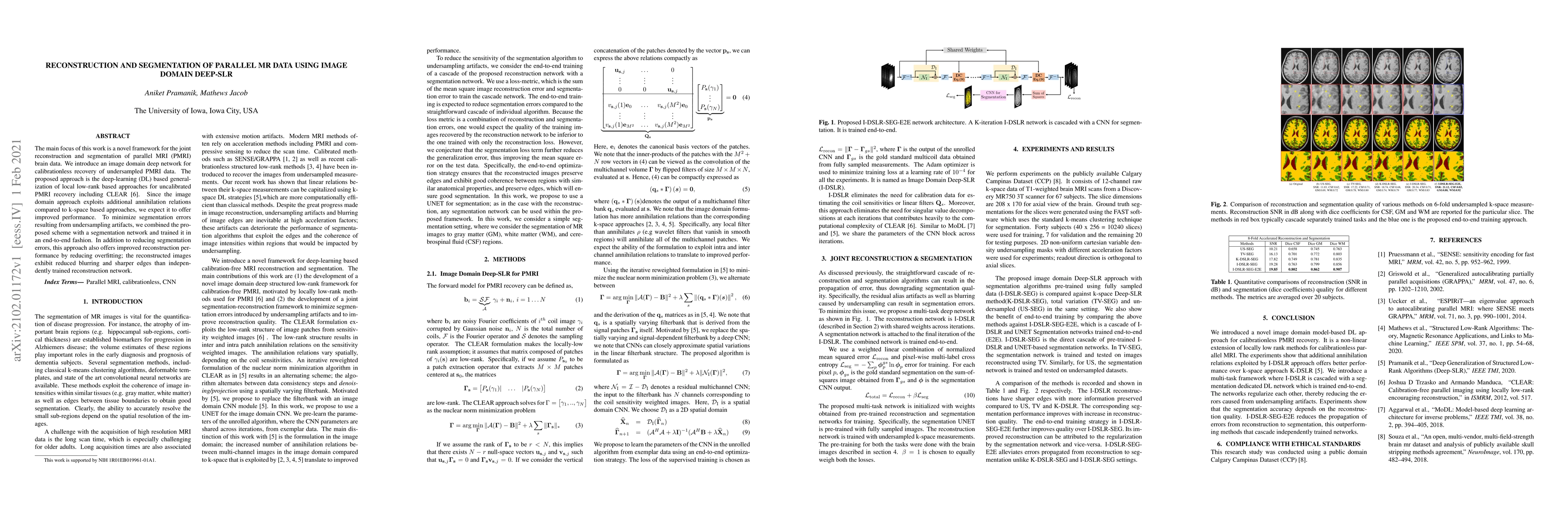 The main focus of this work is a novel framework for the joint reconstruction and segmentation of parallel MRI (PMRI) brain data. We introduce an image domain deep network for calibrationless recovery of undersampled PMRI data. The proposed approach is the deep-learning (DL) based generalization of local low-rank based approaches for uncalibrated PMRI recovery including CLEAR [6]. Since the image domain approach exploits additional annihilation relations compared to k-space based approaches, we expect it to offer improved performance. To minimize segmentation errors resulting from undersampling artifacts, we combined the proposed scheme with a segmentation network and trained it in an end-to-end fashion. In addition to reducing segmentation errors, this approach also offers improved reconstruction performance by reducing overfitting; the reconstructed images exhibit reduced blurring and sharper edges than independently trained reconstruction network.
