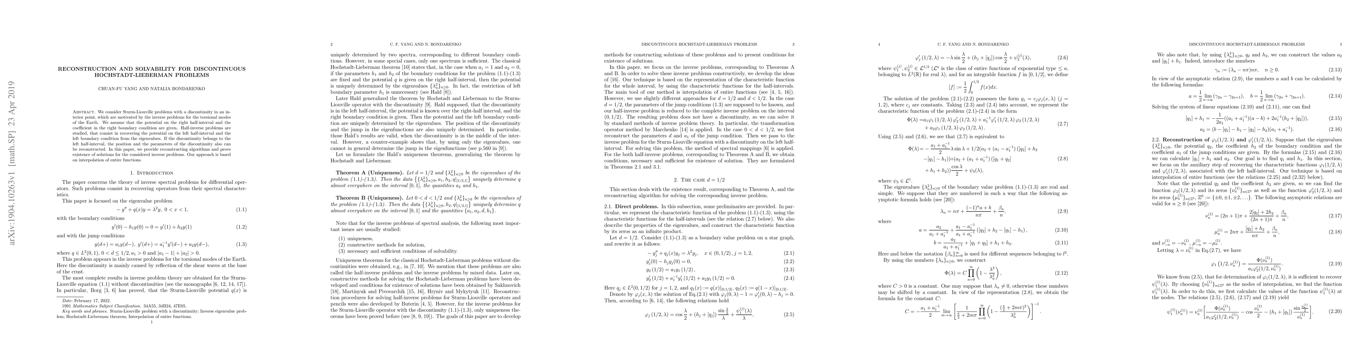 We consider Sturm-Liouville problems with a discontinuity in an interior point, which are motivated by the inverse problems for the torsional modes of the Earth. We assume that the potential on the right half-interval and the coefficient in the right boundary condition are given. Half-inverse problems are studied, that consist in recovering the potential on the left half-interval and the left boundary condition from the eigenvalues. If the discontinuity belongs to the left half-interval, the position and the parameters of the discontinuity also can be reconstructed. In this paper, we provide reconstructing algorithms and prove existence of solutions for the considered inverse problems. Our approach is based on interpolation of entire functions.