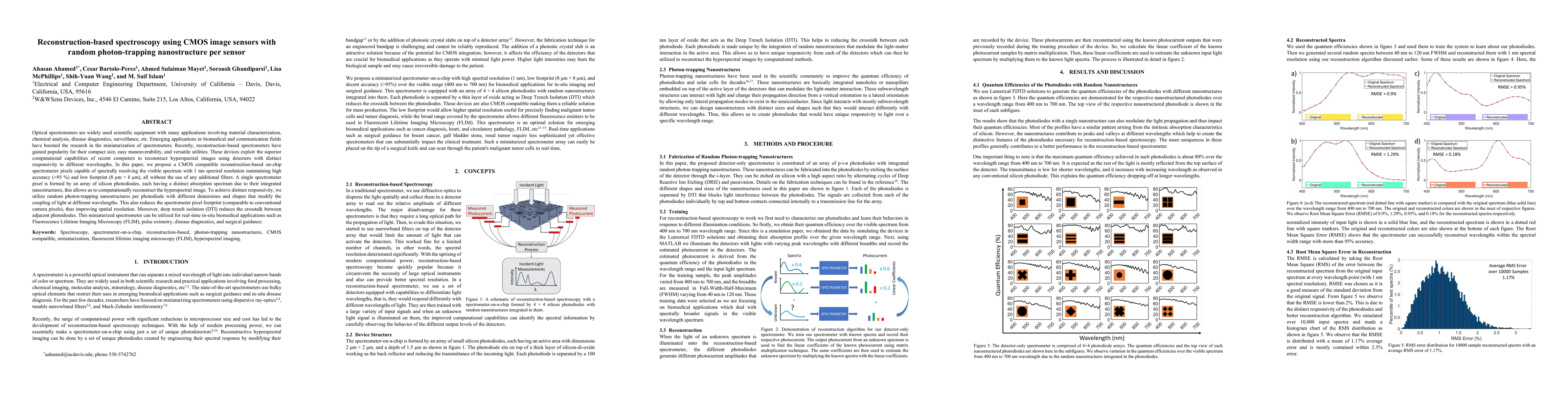 This paper proposes a miniaturized spectrometer using CMOS image sensors with random photon-trapping nanostructures that can resolve the visible spectrum with 1 nm spectral resolution.
