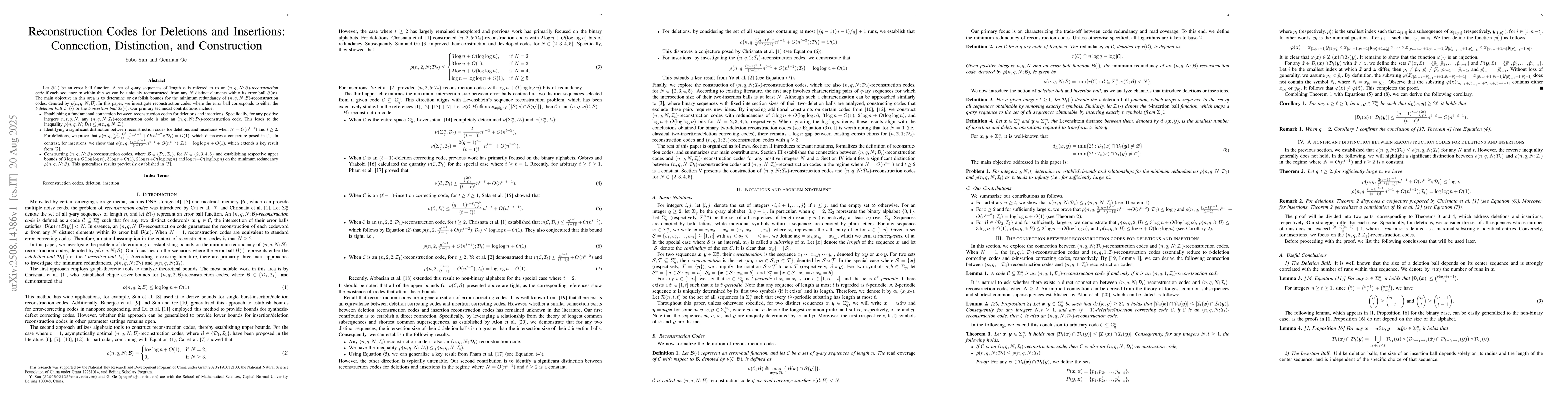 The paper introduces novel methods for connecting reconstruction codes for deletions and insertions, distinguishing their properties, and constructing codes with specific redundancy bounds.