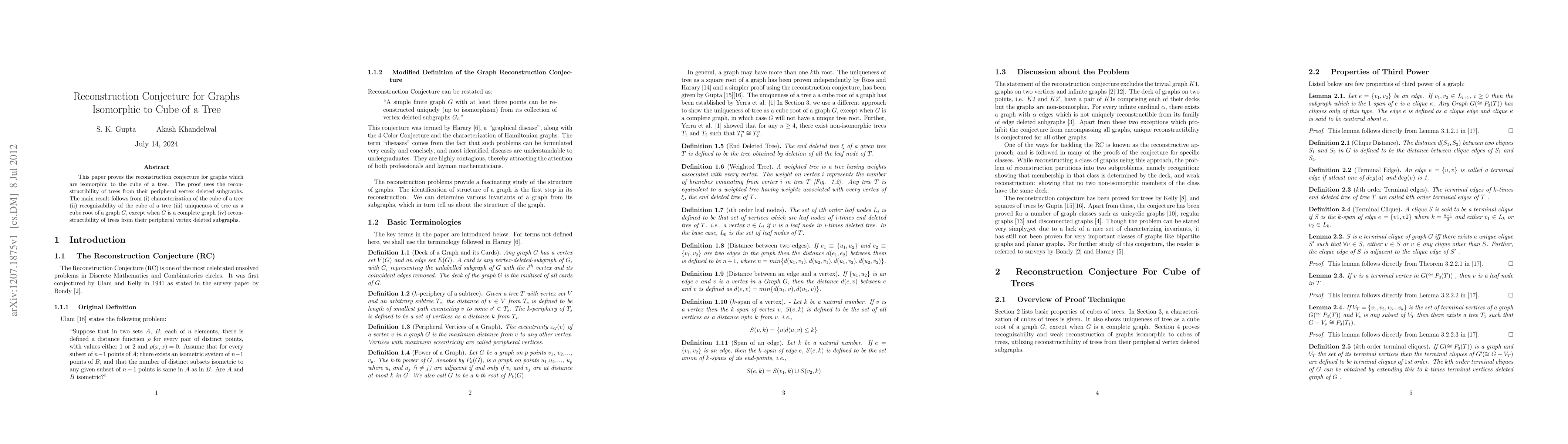This paper proves the reconstruction conjecture for graphs which are isomorphic to the cube of a tree. The proof uses the reconstructibility of trees from their peripheral vertex deleted subgraphs. The main result follows from (i) characterization of the cube of a tree (ii) recognizability of the cube of a tree (iii) uniqueness of tree as a cube root of a graph G, except when G is a complete graph (iv) reconstructibility of trees from their peripheral vertex deleted subgraphs.