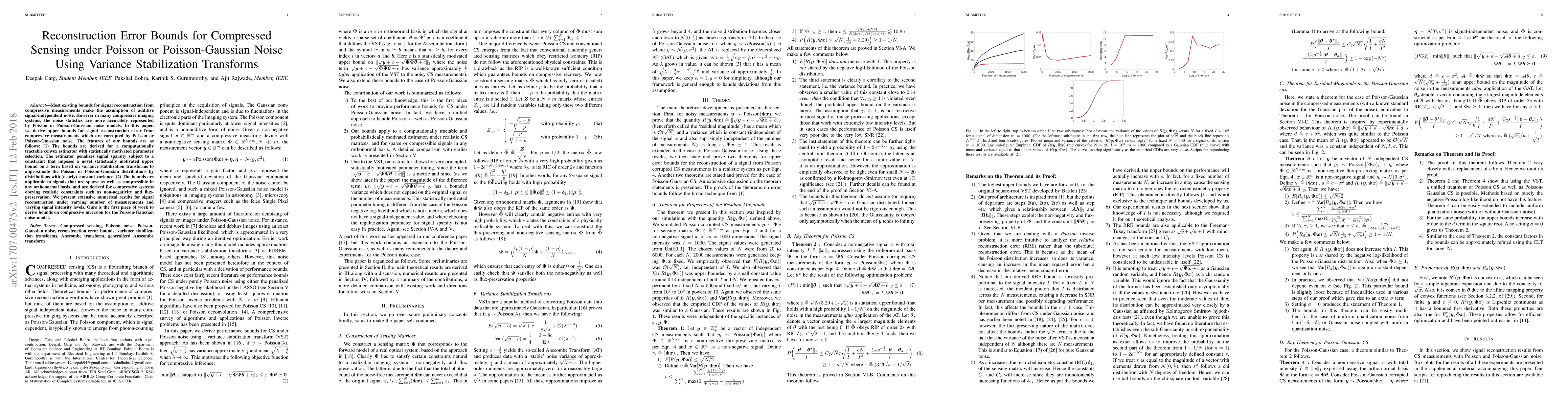 This paper derives upper bounds for reconstruction error in compressed sensing under Poisson or Poisson-Gaussian noise, using a convex estimator with variance stabilization transforms. The bounds apply to sparse and compressible signals, and are validated through numerical experiments.