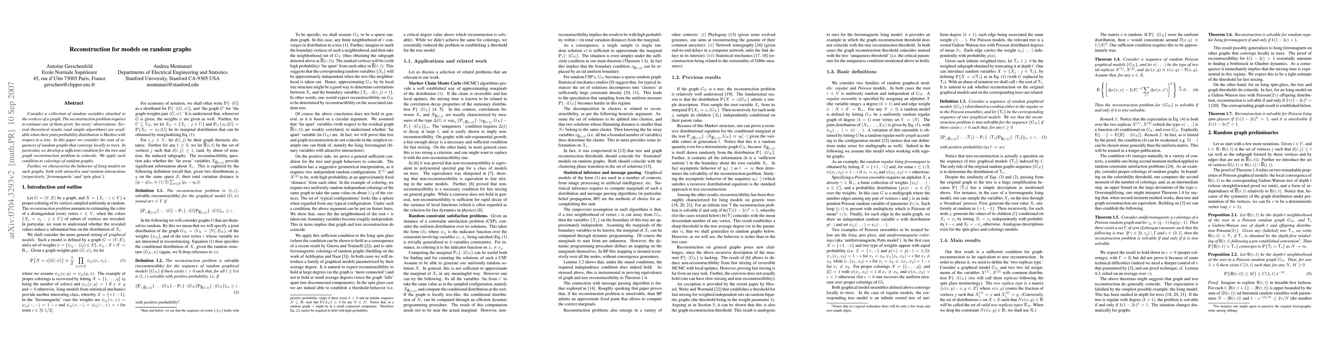 Consider a collection of random variables attached to the vertices of a graph. The reconstruction problem requires to estimate one of them given `far away' observations. Several theoretical results (and simple algorithms) are available when their joint probability distribution is Markov with respect to a tree. In this paper we consider the case of sequences of random graphs that converge locally to trees. In particular, we develop a sufficient condition for the tree and graph reconstruction problem to coincide. We apply such condition to colorings of random graphs. Further, we characterize the behavior of Ising models on such graphs, both with attractive and random interactions (respectively, `ferromagnetic' and `spin glass').