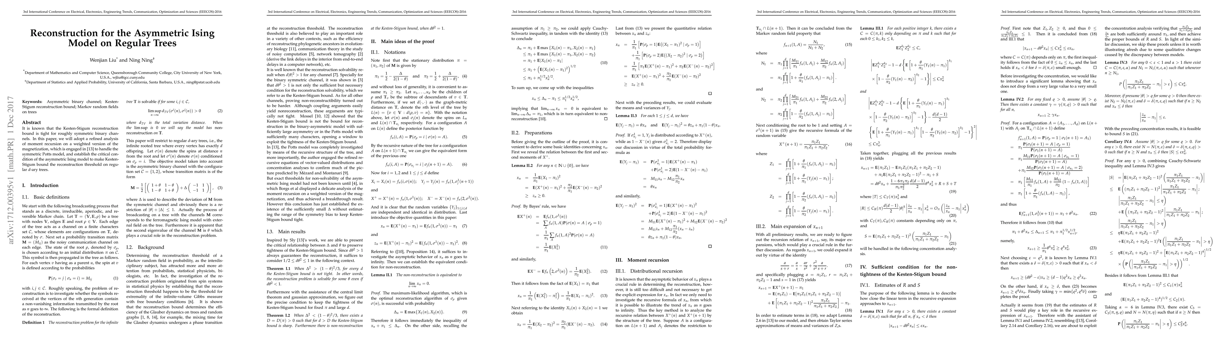 This paper establishes a critical condition for the asymmetric Ising model on regular d-ary trees, proving that Kesten-Stigum bound is the reconstruction threshold under certain conditions.