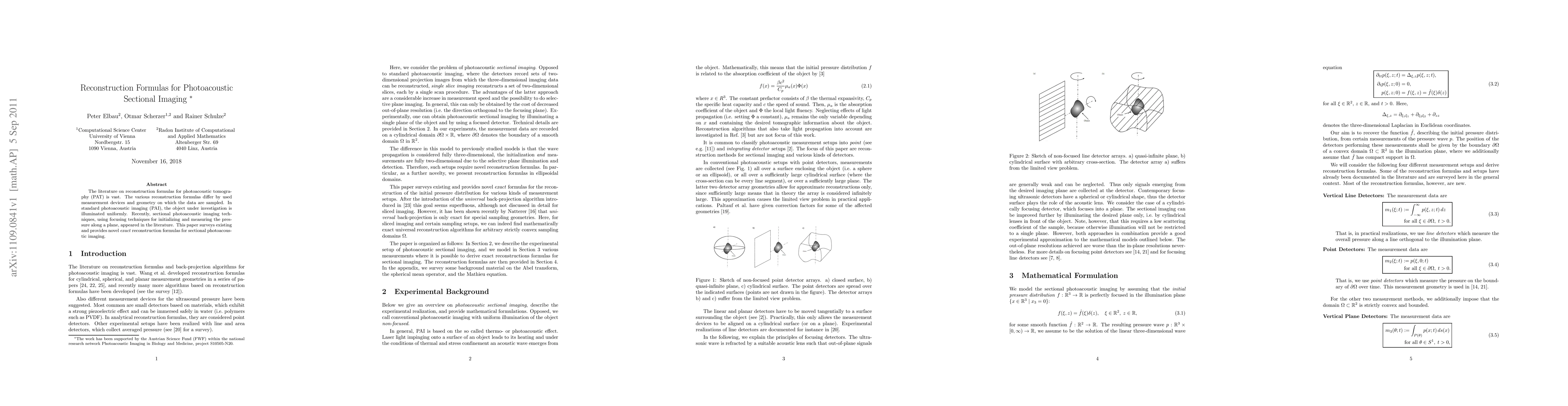 This paper surveys and introduces new exact reconstruction formulas for sectional photoacoustic imaging, contrasting with traditional methods that uniformly illuminate the object and focusing on techniques that measure pressure along a plane.
