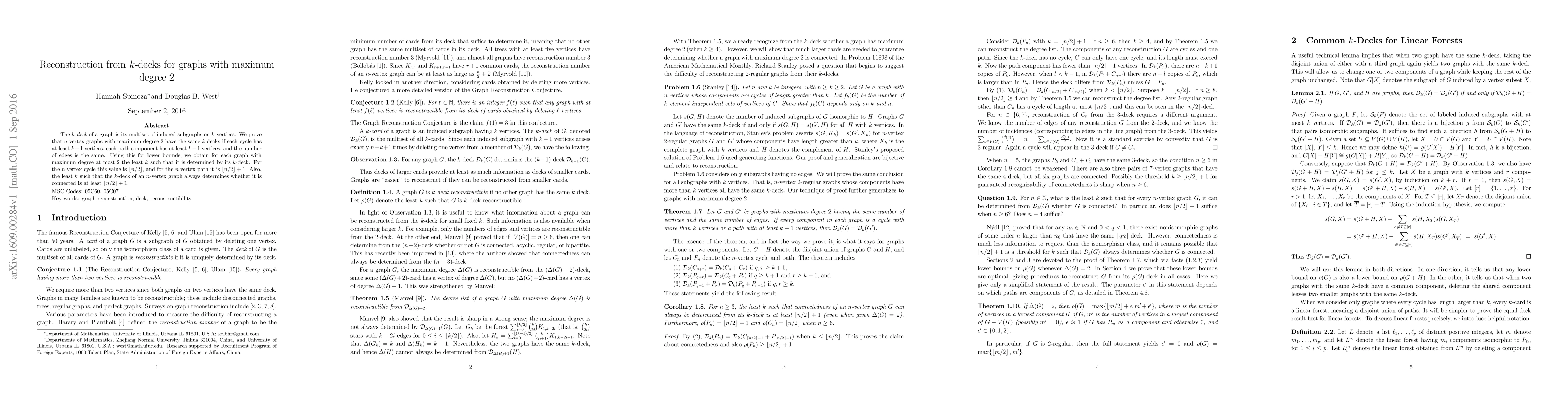 The $k$-deck of a graph is its multiset of induced subgraphs on $k$ vertices. We prove that $n$-vertex graphs with maximum degree $2$ have the same $k$-decks if each cycle has at least $k+1$ vertices, each path component has at least $k-1$ vertices, and the number of edges is the same. Using this for lower bounds, we obtain for each graph with maximum degree at most $2$ the least $k$ such that it is determined by its $k$-deck. For the $n$-vertex cycle this value is $\lfloor n/2 \rfloor$, and for the $n$-vertex path it is $\lfloor n/2 \rfloor+1$. Also, the least $k$ such that the $k$-deck of an $n$-vertex graph always determines whether it is connected is at least $\lfloor n/2 \rfloor +1$.