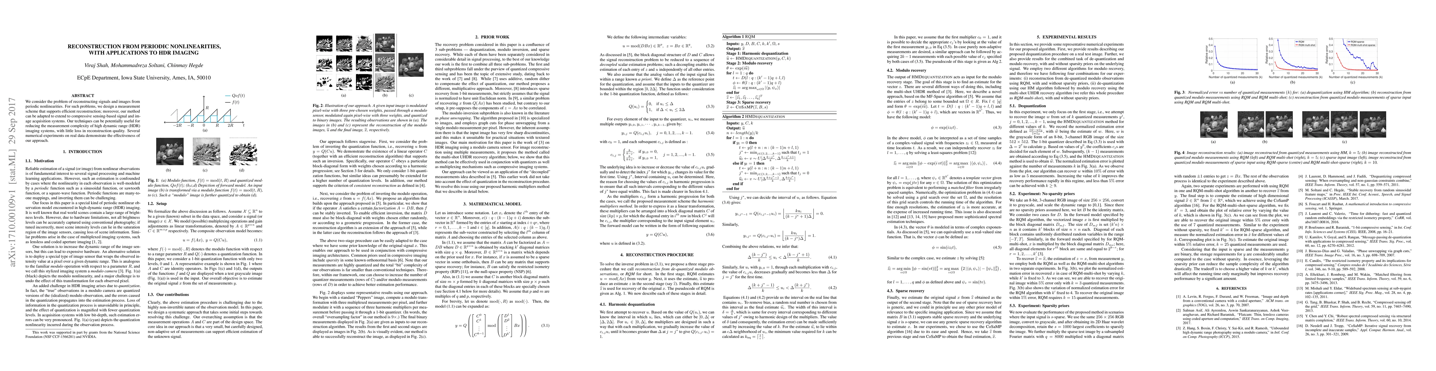 This paper proposes a method for reconstructing signals and images distorted by periodic nonlinearities, with a focus on applications in high dynamic range (HDR) imaging. The authors introduce an efficient measurement scheme adaptable to compressive sensing systems, aiming to reduce measurement complexity while maintaining reconstruction quality.