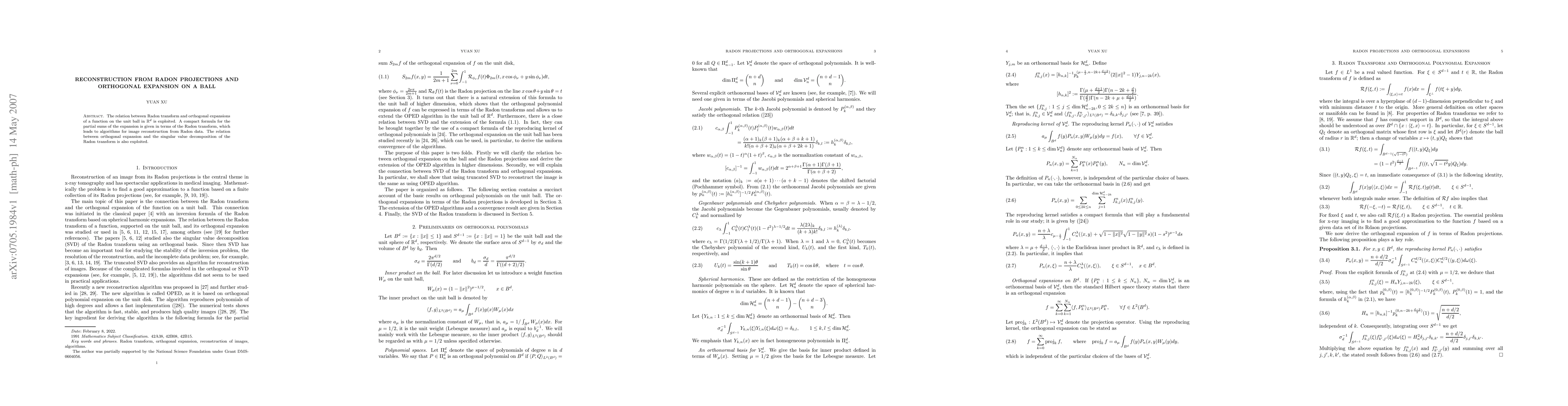 The relation between Radon transform and orthogonal expansions of a function on the unit ball in $\RR^d$ is exploited. A compact formula for the partial sums of the expansion is given in terms of the Radon transform, which leads to algorithms for image reconstruction from Radon data. The relation between orthogonal expansion and the singular value decomposition of the Radon transform is also exploited.