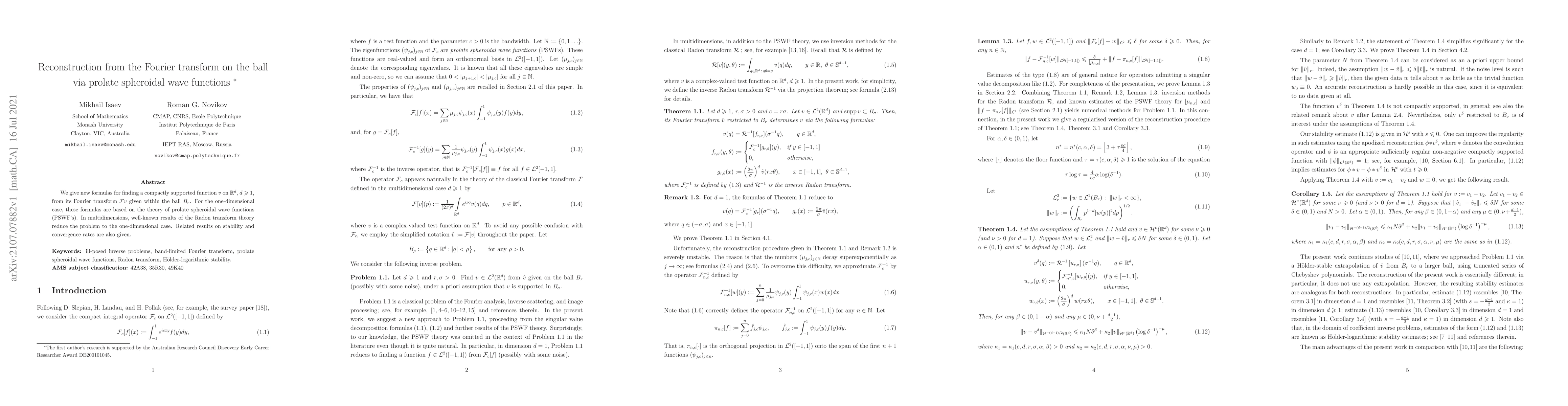 This paper presents new formulas for reconstructing a compactly supported function from its Fourier transform within a ball, utilizing prolate spheroidal wave functions for the one-dimensional case and applying Radon transform theory to extend the method to higher dimensions. Stability and convergence rates of the reconstruction are also discussed.