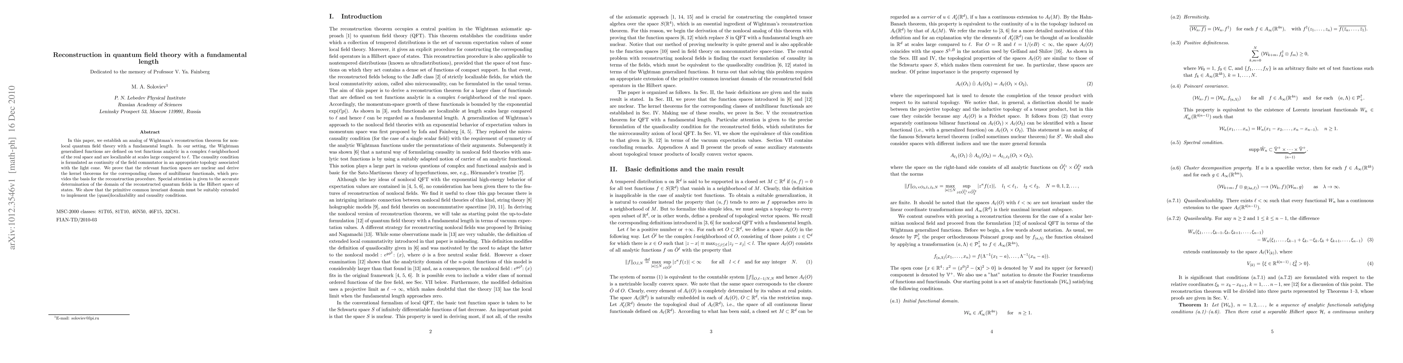 In this paper, we establish an analog of Wightman's reconstruction theorem for nonlocal quantum field theory with a fundamental length. In our setting, the Wightman generalized functions are defined on test functions analytic in a complex l-neighborhood of the real space and are localizable at scales large compared to l. The causality condition is formulated as continuity of the field commutator in an appropriate topology associated with the light cone. We prove that the relevant function spaces are nuclear and derive the kernel theorems for the corresponding classes of multilinear functionals, which provides the basis for the reconstruction procedure. Special attention is given to the accurate determination of the domain of the reconstructed quantum fields in the Hilbert space of states. We show that the primitive common invariant domain must be suitably extended to implement the (quasi)localizability and causality conditions.