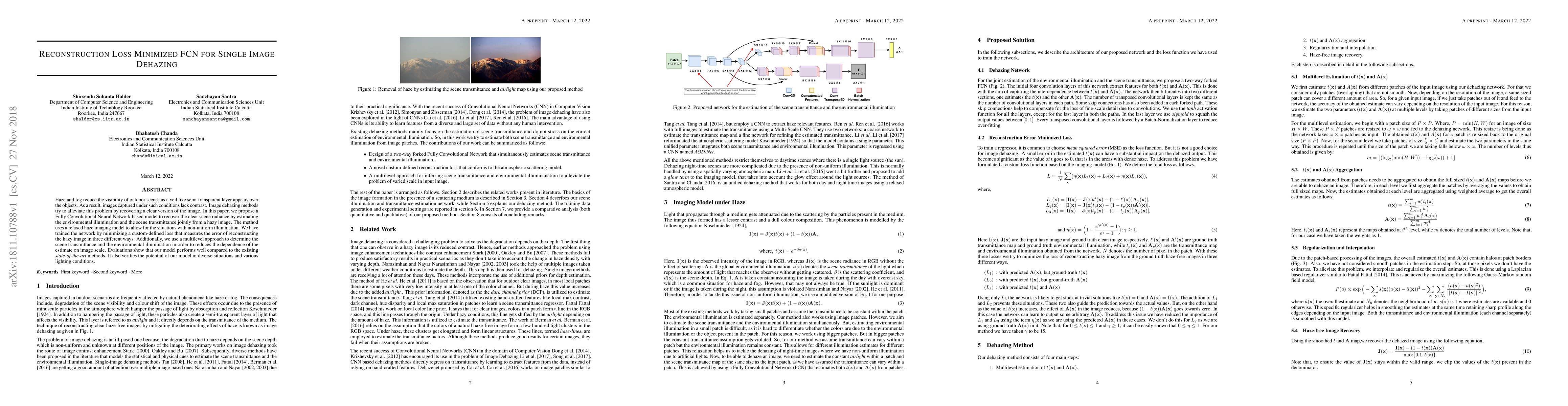 Haze and fog reduce the visibility of outdoor scenes as a veil like semi-transparent layer appears over the objects. As a result, images captured under such conditions lack contrast. Image dehazing methods try to alleviate this problem by recovering a clear version of the image. In this paper, we propose a Fully Convolutional Neural Network based model to recover the clear scene radiance by estimating the environmental illumination and the scene transmittance jointly from a hazy image. The method uses a relaxed haze imaging model to allow for the situations with non-uniform illumination. We have trained the network by minimizing a custom-defined loss that measures the error of reconstructing the hazy image in three different ways. Additionally, we use a multilevel approach to determine the scene transmittance and the environmental illumination in order to reduce the dependence of the estimate on image scale. Evaluations show that our model performs well compared to the existing state-of-the-art methods. It also verifies the potential of our model in diverse situations and various lighting conditions.