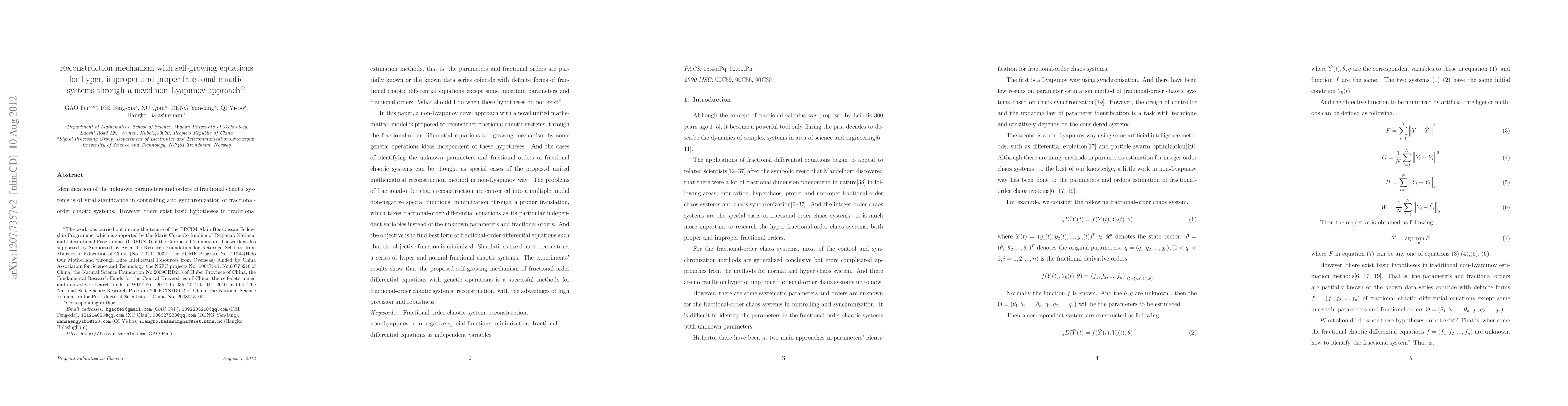 This paper proposes a novel non-Lyapunov approach for reconstructing fractional chaotic systems without relying on traditional hypotheses. It uses a self-growing mechanism based on fractional-order differential equations and genetic operations to achieve high precision and robustness in identifying unknown parameters and fractional orders.