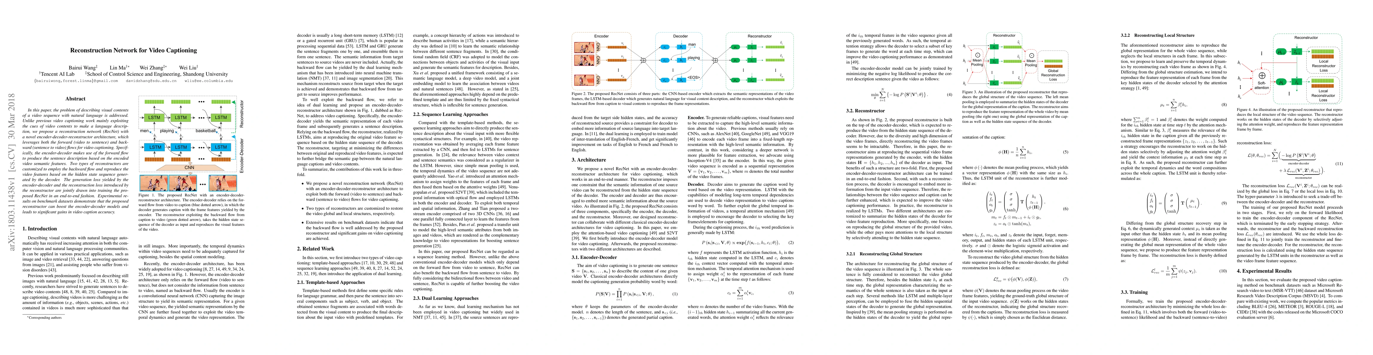 This paper proposes a reconstruction network (RecNet) for video captioning that uses an encoder-decoder-reconstructor architecture to leverage both forward and backward flows. The reconstructor enhances the encoder-decoder by reproducing video features from the generated sentence, leading to significant improvements in caption accuracy.