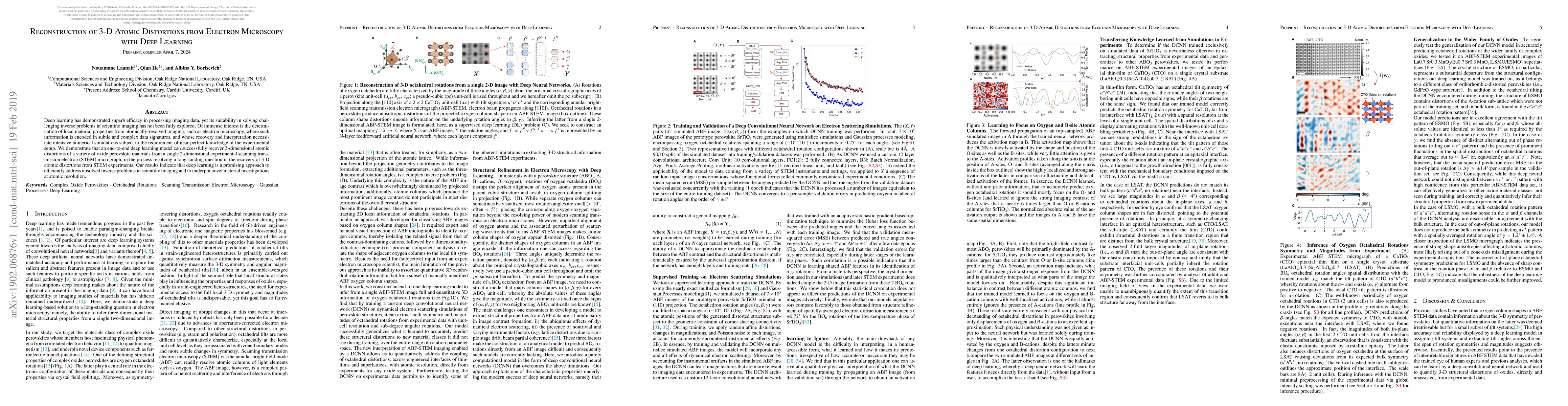 This paper demonstrates that deep learning can effectively reconstruct 3-D atomic distortions from 2-D scanning transmission electron microscopy (STEM) images, addressing a longstanding challenge in scientific imaging. The approach shows promise for solving complex inverse problems in material science.