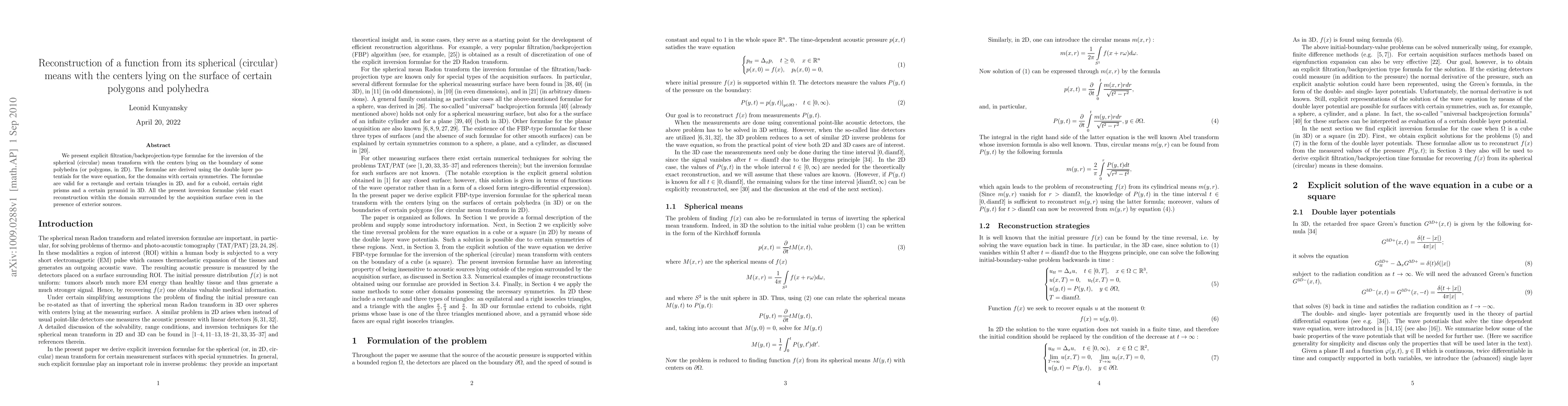 We present explicit filtration/backprojection-type formulae for the inversion of the spherical (circular) mean transform with the centers lying on the boundary of some polyhedra (or polygons, in 2D). The formulae are derived using the double layer potentials for the wave equation, for the domains with certain symmetries. The formulae are valid for a rectangle and certain triangles in 2D, and for a cuboid, certain right prisms and a certain pyramid in 3D. All the present inversion formulae yield exact reconstruction within the domain surrounded by the acquisition surface even in the presence of exterior sources.