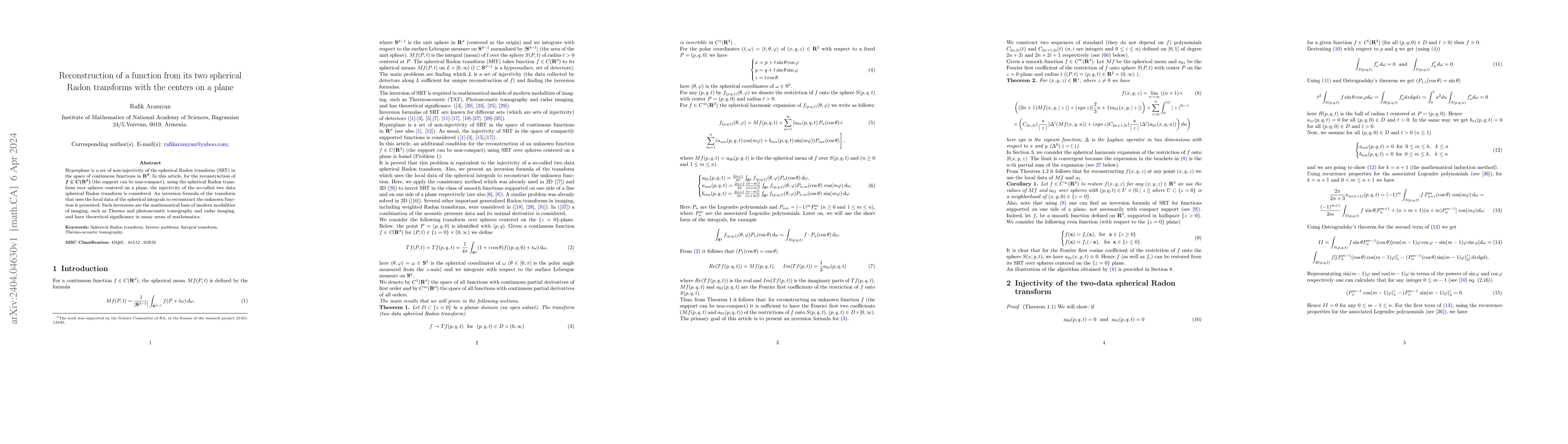 This paper presents an inversion formula for reconstructing an unknown function from its two spherical Radon transforms with centers on a plane, addressing the non-injectivity issue caused by hyperplanes. The method is foundational for imaging modalities like thermo, photoacoustic tomography, and radar imaging.