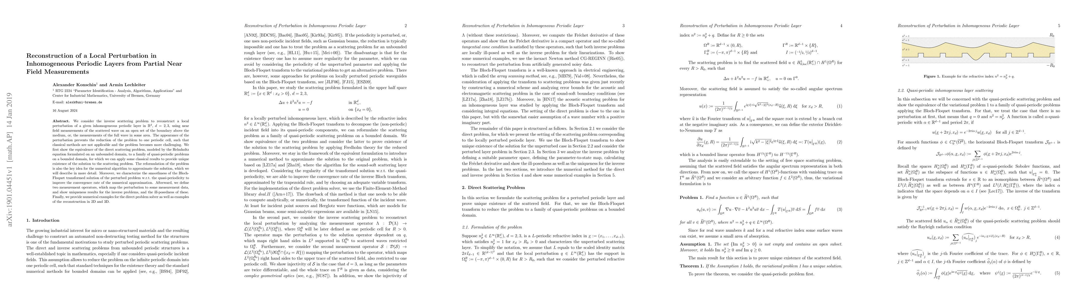 This paper addresses the inverse scattering problem for reconstructing a local perturbation in inhomogeneous periodic layers using partial near field measurements. It reformulates the problem to apply classical results and develops a numerical algorithm for solution approximation, demonstrating its effectiveness through numerical examples in 2D and 3D.