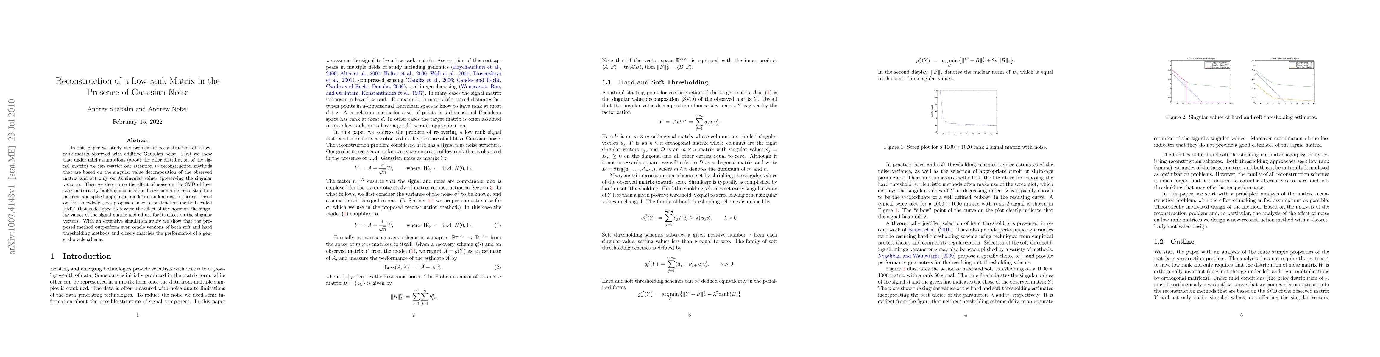 This paper proposes a new method called RMT for reconstructing low-rank matrices observed with Gaussian noise, leveraging connections to the spiked population model in random matrix theory. The method outperforms existing thresholding techniques in simulations.
