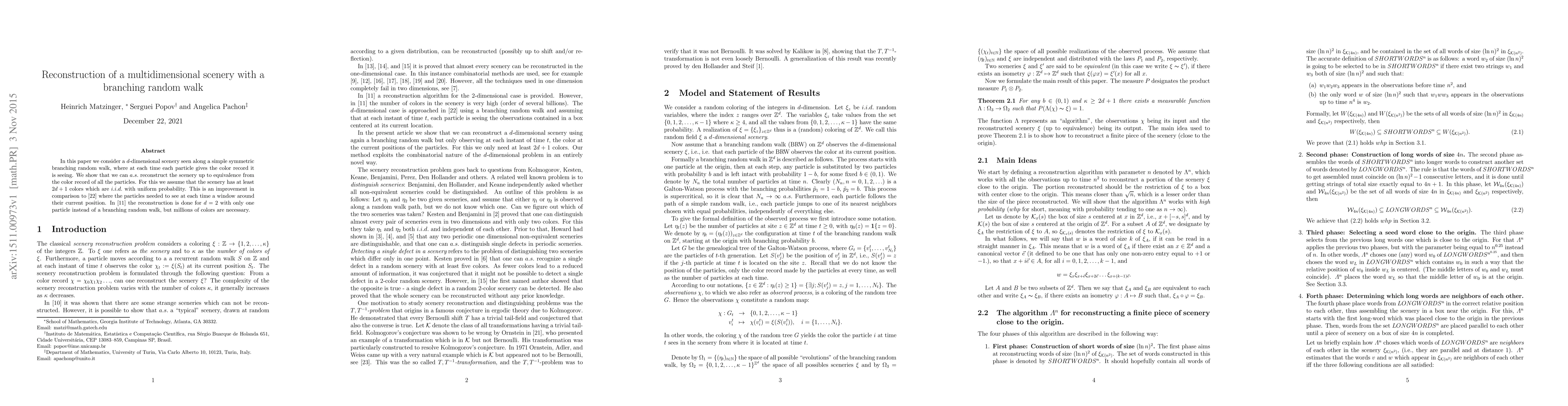 This paper demonstrates the reconstruction of a d-dimensional scenery from the color records of a simple symmetric branching random walk, showing that the scenery can be reconstructed up to equivalence. The method requires at least 2d + 1 colors, improving upon previous methods that needed larger color windows or more colors.