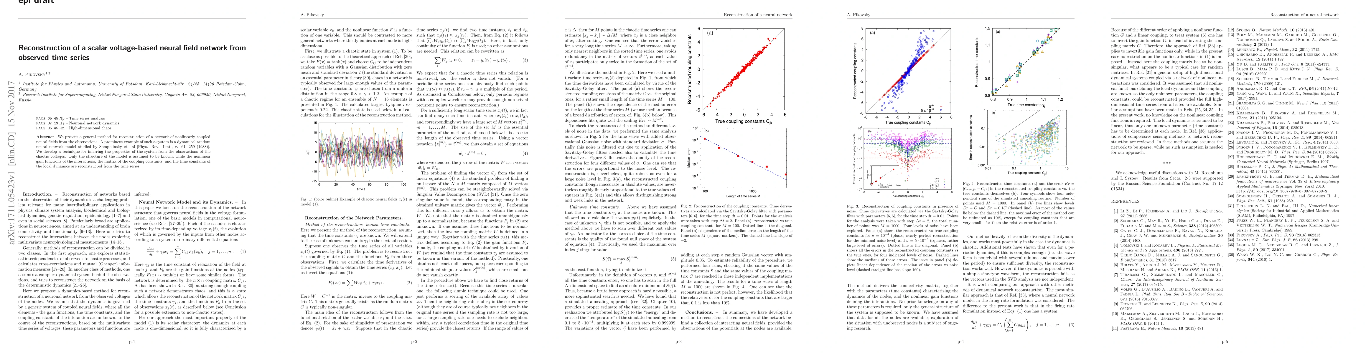 This paper introduces a method to reconstruct a scalar voltage-based neural field network from observed time series data. It infers unknown parameters like nonlinear gain functions, coupling constants, and time constants from chaotic voltage observations, assuming only the network structure is known.